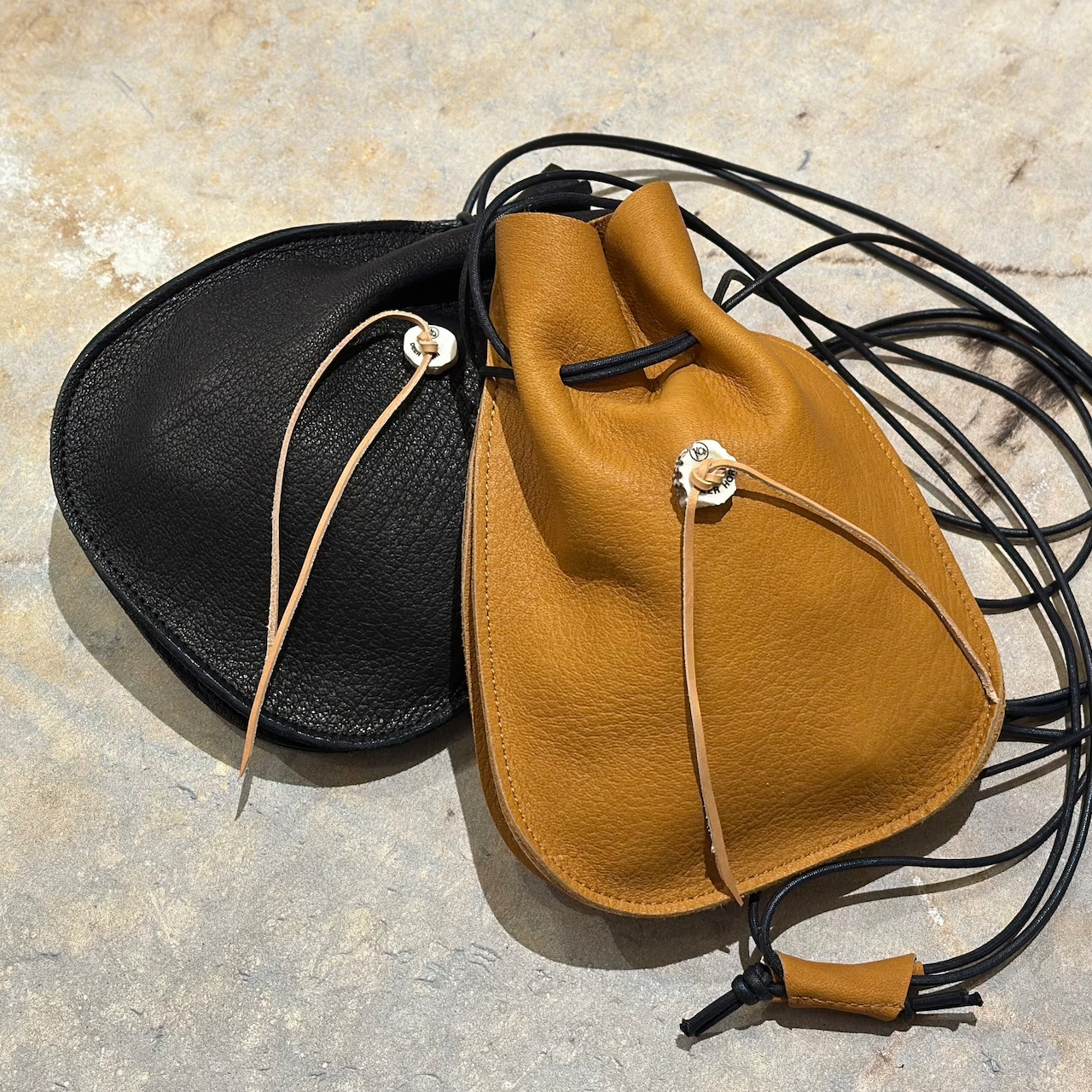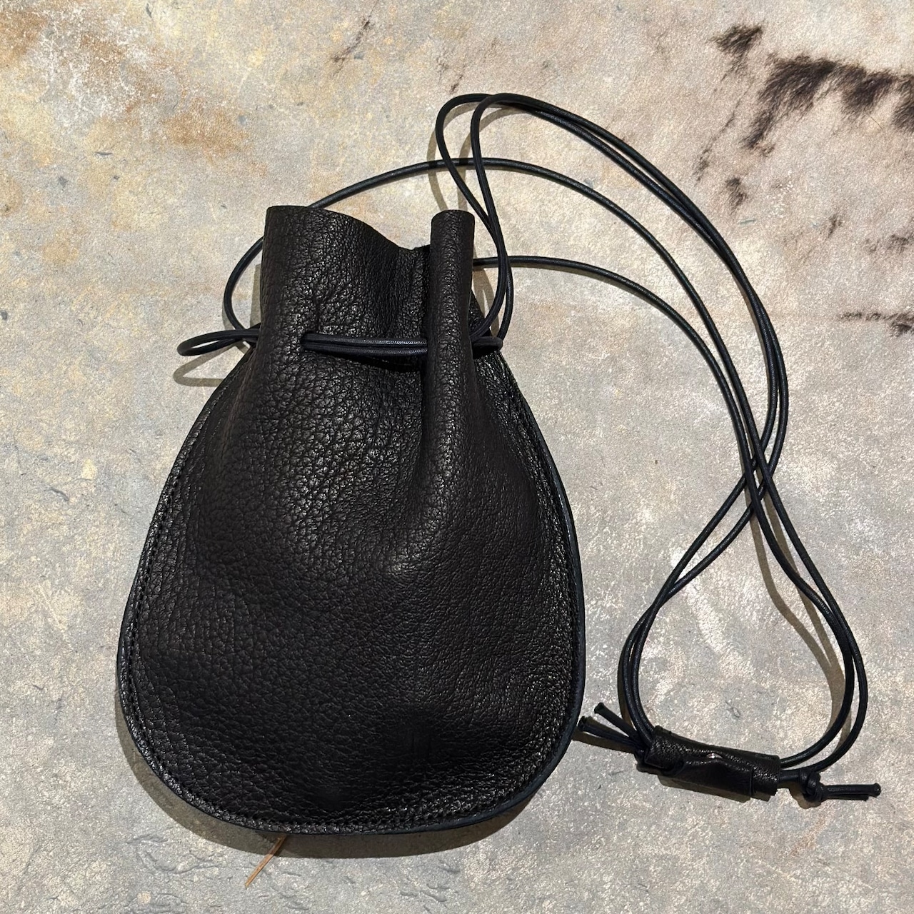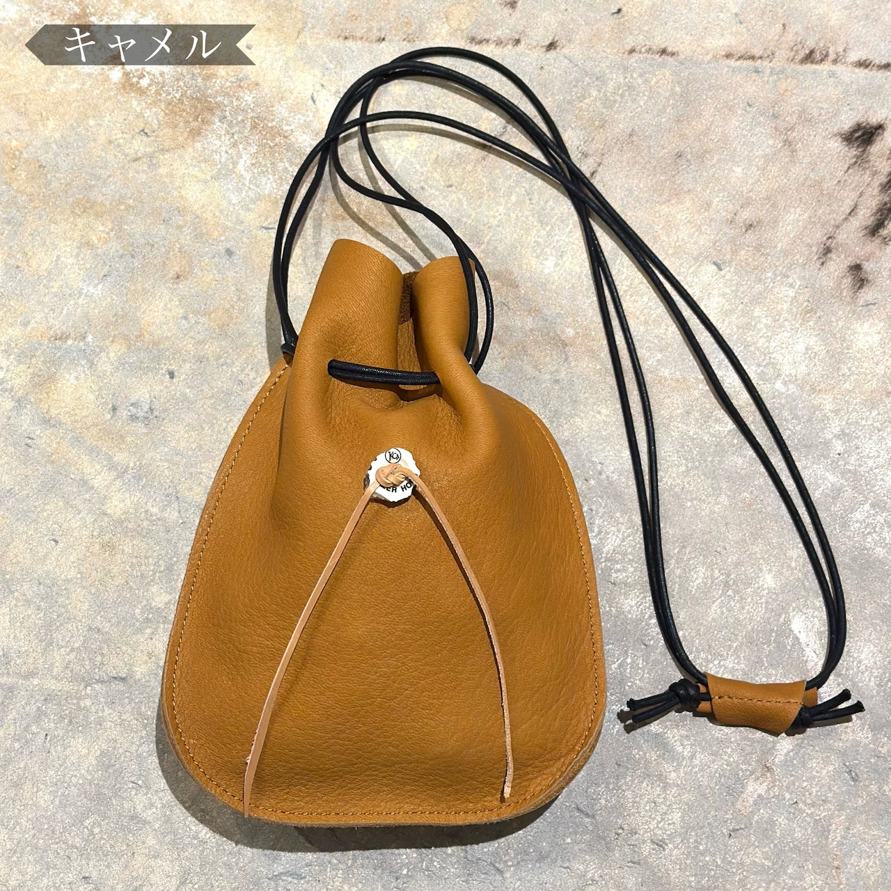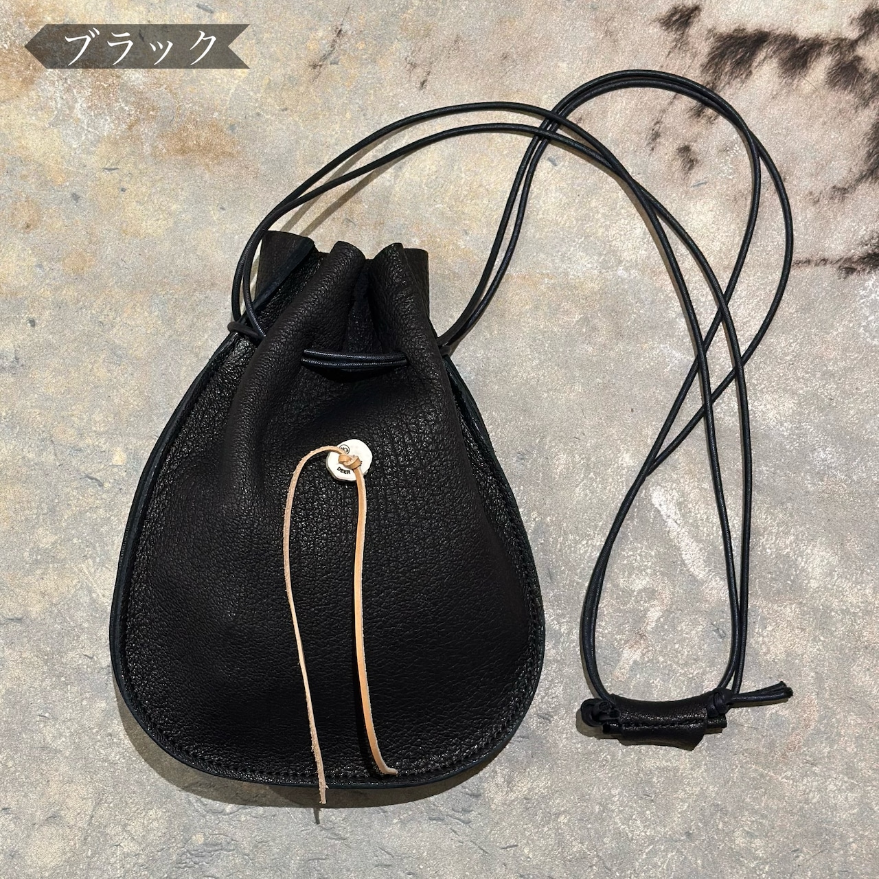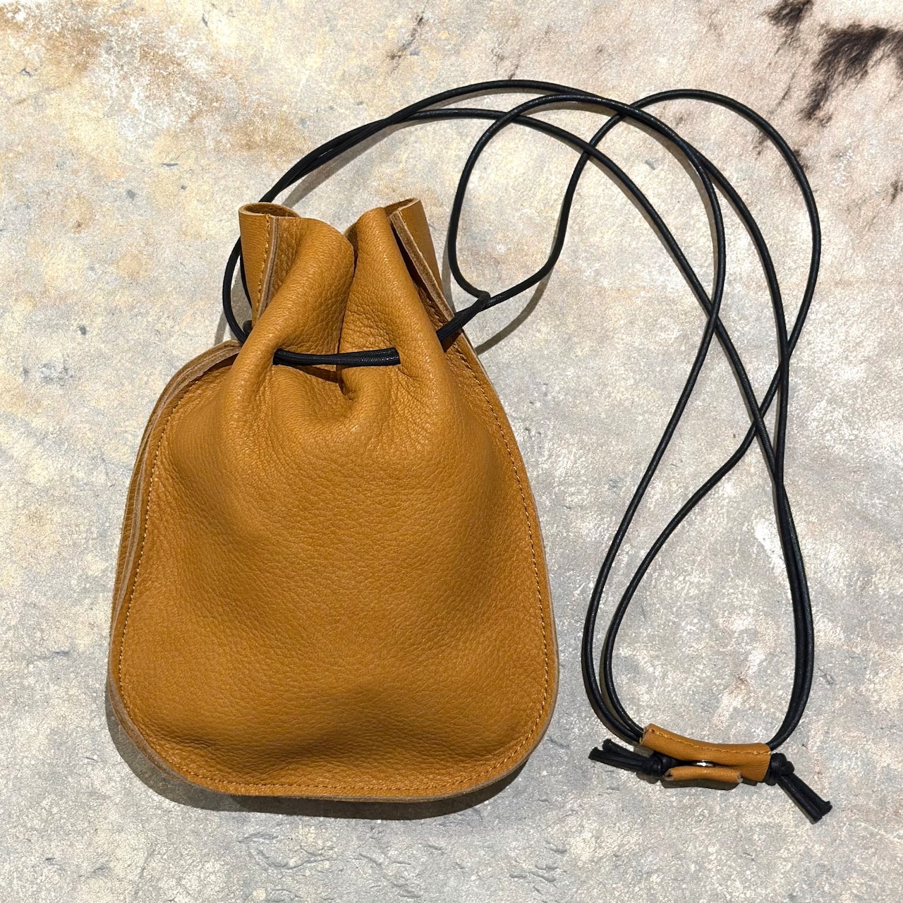 シカ革の巾着ポーチ。しっかり、しなやかで柔らかい質感の上質なシカ革をセレクトし、あえてシカ革1枚のみで仕上げる事でよりレザー本来の素材感を楽しめる仕様に仕上げました。