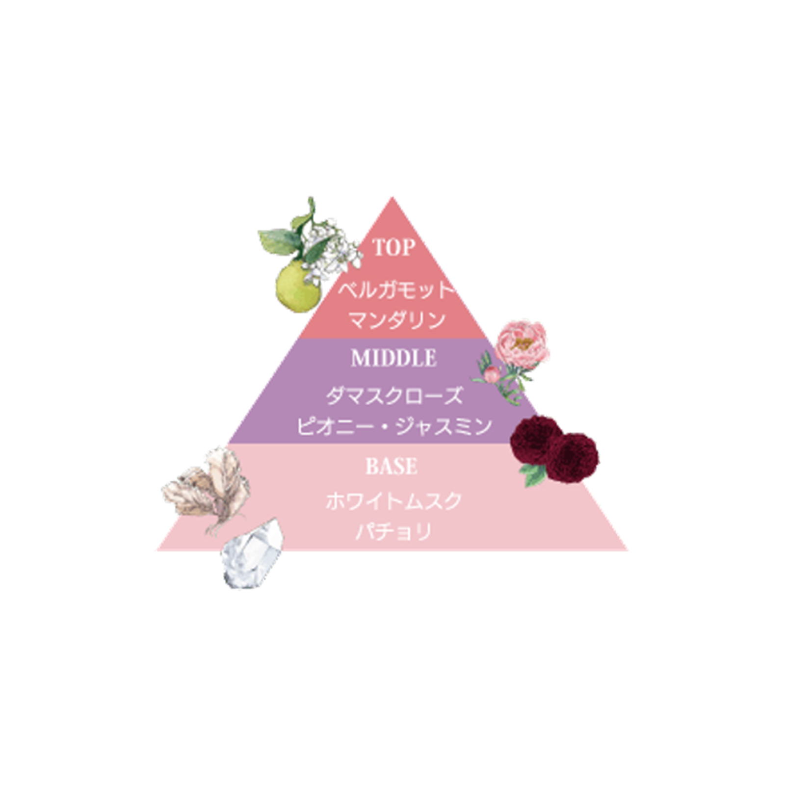 かわいらしくフレッシュなピンク色のムードに満ちた香り。 ほのかな息遣いのように飛び回るバラとジャスミンがロマンチックに香り、白いヴェールの感触のように柔らかくて愛らしい印象を与えます。