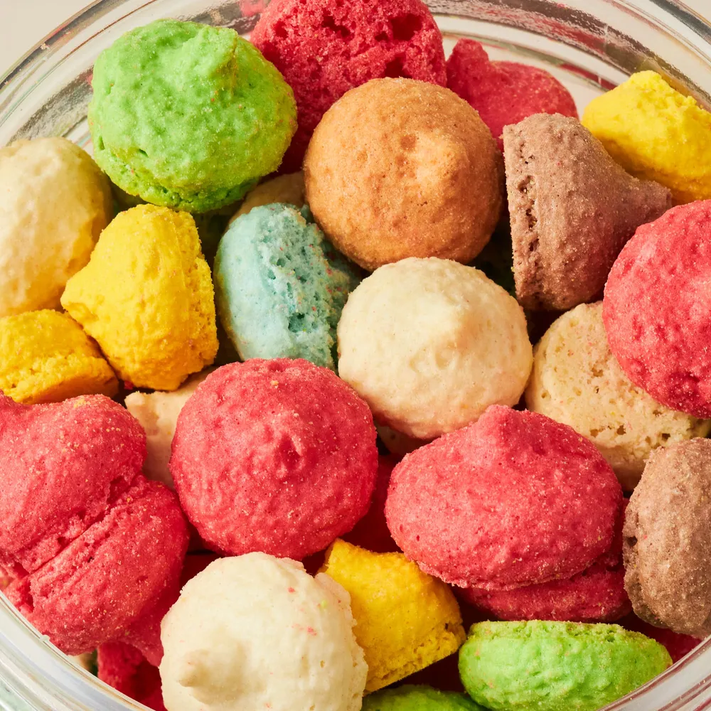 7種類のお味(ショコラ、シトロン、ピスターシュ、カラメル、バニラ、イチゴ、アーモンド)と、クリスマスモチーフのラスクが入っています。 マカロン生地を小さく絞り焼き上げたサクサク食感のお菓子です。