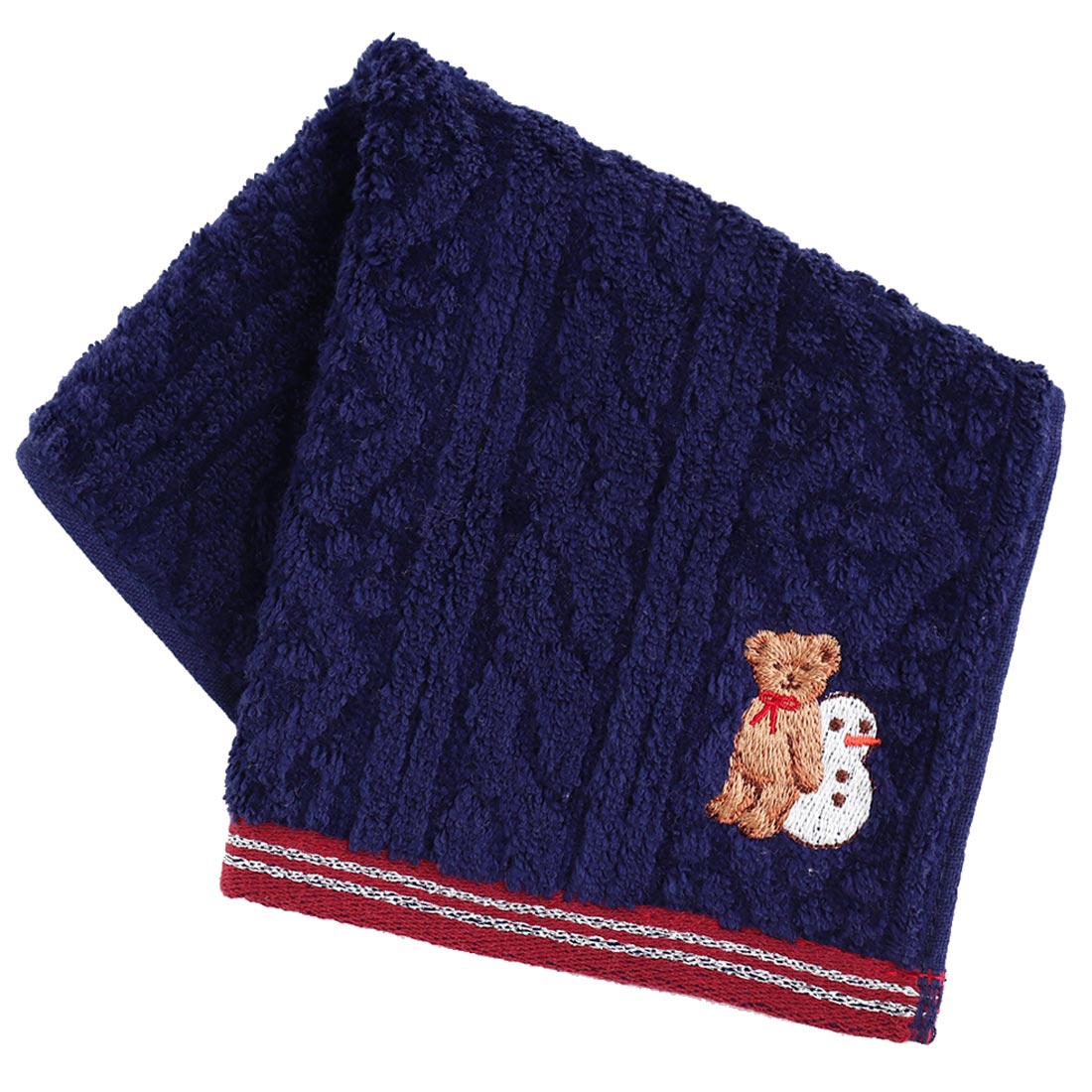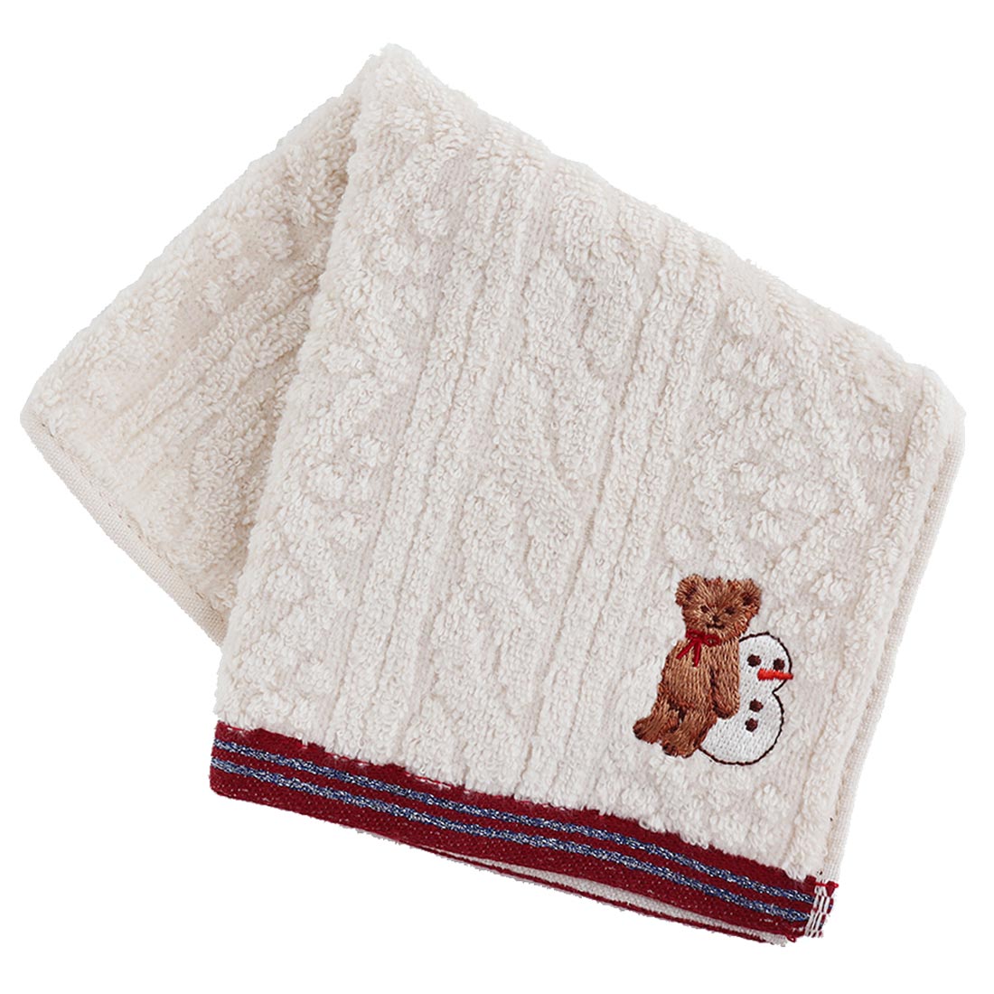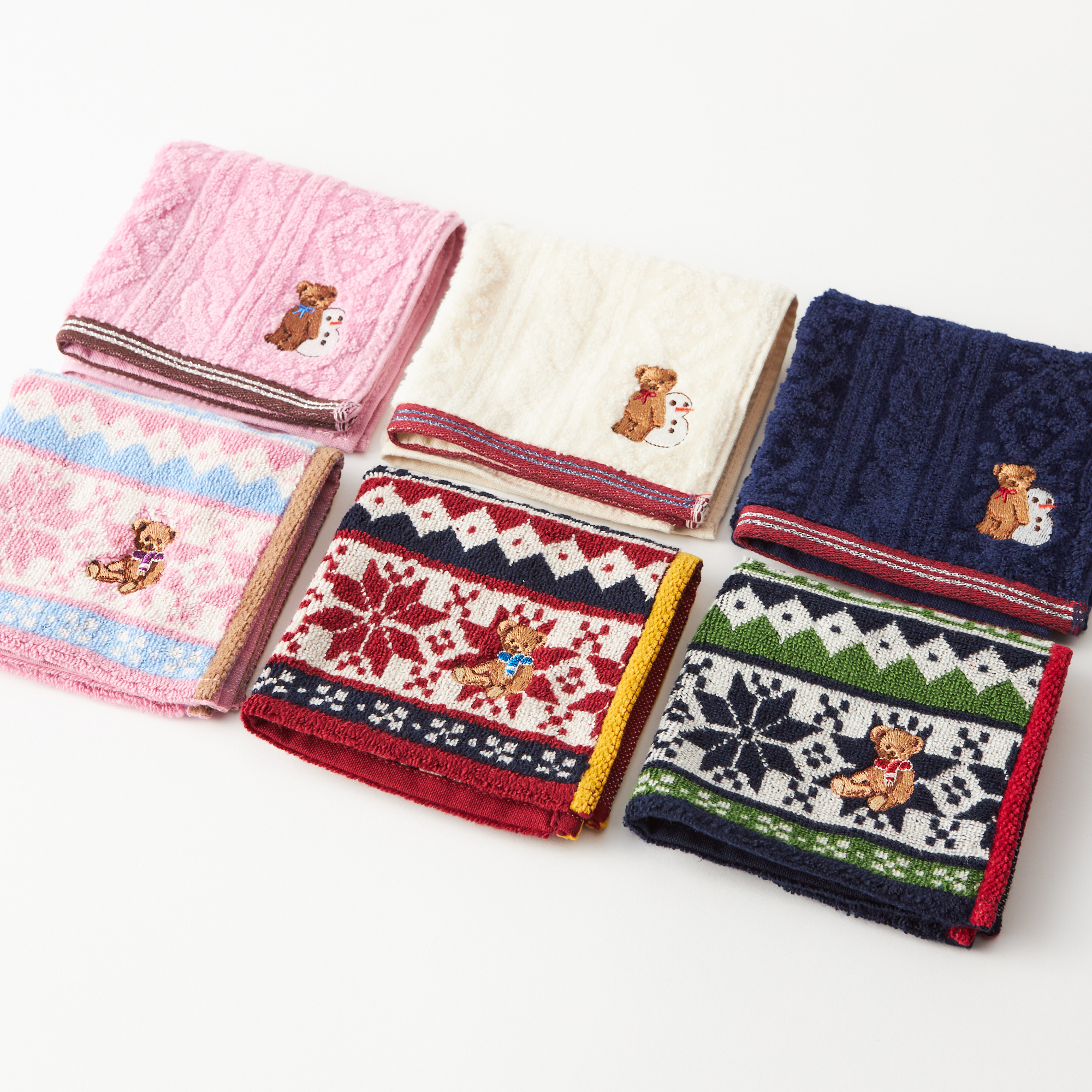 シャーリングや無撚糸、ガーゼ織など多彩な織のテクニックを使用した、楽しい冬柄のタオル。