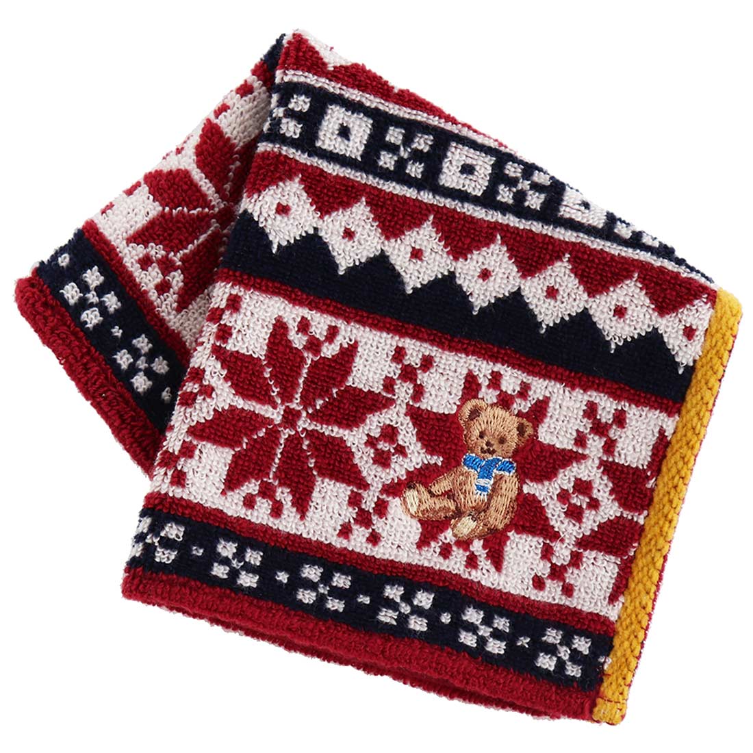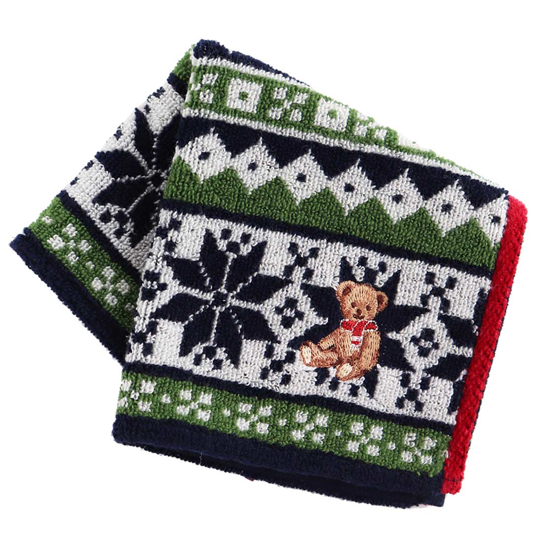 | ホリデーベア タオルハンカチ | ■外装サイズ:幅21cm×縦15cm×高さ5cm ■本体サイズ:約25cm×25cm ■素材:綿100%(スリット糸使用) |