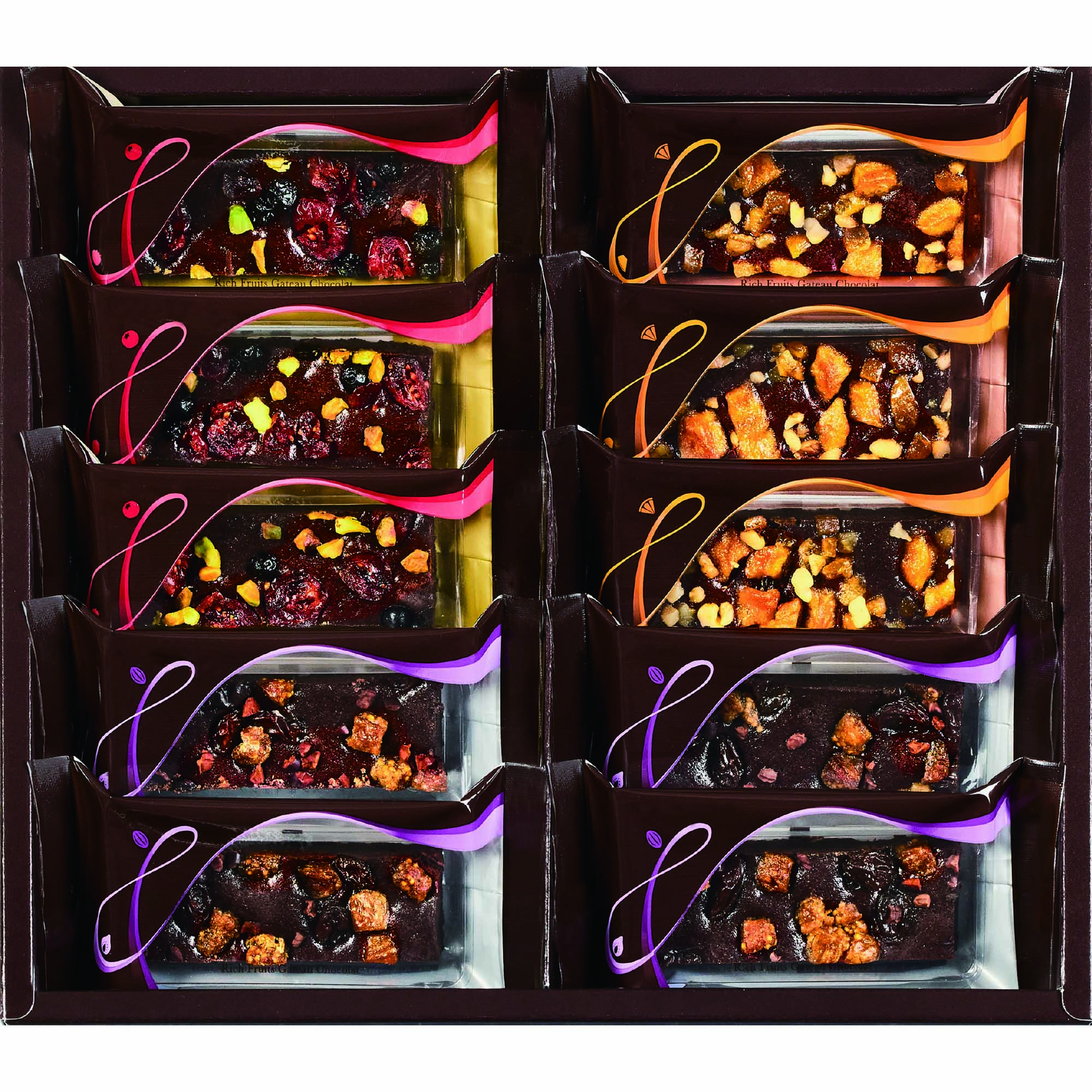 | 贅沢フルーツのガトーショコラ | ■外装サイズ ・9号:幅27.6cm×縦16.0cm×高さ4.1cm ・10号:幅27.6cm×縦24.4cm×高さ4.1cm ・15号:幅40.3cm×縦24.4cm×高さ4.1cm ■賞味期限/消費期限:120日 ■アレルゲン情報:くるみ、小麦、卵、乳成分、オレンジ、大豆、りんご ■原材料 <ベリー&ベリー>チョコレート (国内製造)、 液卵、マーガリン、クランベリー砂糖漬 (クランベリー、砂糖、植物油脂)、キャラメルペースト、クリーム、 小麦粉、砂糖、 転化糖、ラズベリー加工品、ブルーベリー加工品、ピスタチオ、ココアパウダー、食塩/乳化剤、着色料(アントシアニン、カロテノイド)、酸味料、香料、(一部に小麦・卵・乳成分・大豆を含む) <オレンジ&アップル>チョコレート (国内製造)、 液卵、マーガリン、りんご砂糖漬 (りんご、砂糖、植物油脂)、 キャラメルペースト、クリーム、オレンジピール加工品、小麦粉、 転化糖、はちみつ、砂糖、オレンジペースト、くるみ、ココアパウダー、オレンジ果汁加工品、食塩 /乳化剤、酸味料、酸化防止剤(V.C)、香料、着色料 (フラボノイド、レモン果汁)、(一部にくるみ・小麦・卵・乳成分・オレンジ・大豆・りんごを含む) <レーズン&イチジク>チョコレート(国内製造)、液卵、マーガリン、キャラメルペースト、クリーム、レーズン、 乾燥いちじく(白いちじく、米粉)、小麦粉、砂糖、転化糖、カカオニブ、洋酒、ココアパウダー、食塩/乳化剤、香料、(一部に小麦・卵・乳成分・大豆を含む) ■配送方法(常温・冷凍・冷蔵):常温 ■内容量/数量 ・9号:ベリー&ベリー2個、オレンジ&アップル2個、レーズン&イチジク2個 ・10号:ベリー&ベリー3個、オレンジ&アップル3個、レーズン&イチジク4個 ・15号:ベリー&ベリー5個、オレンジ&アップル5個、レーズン&イチジク5個 |