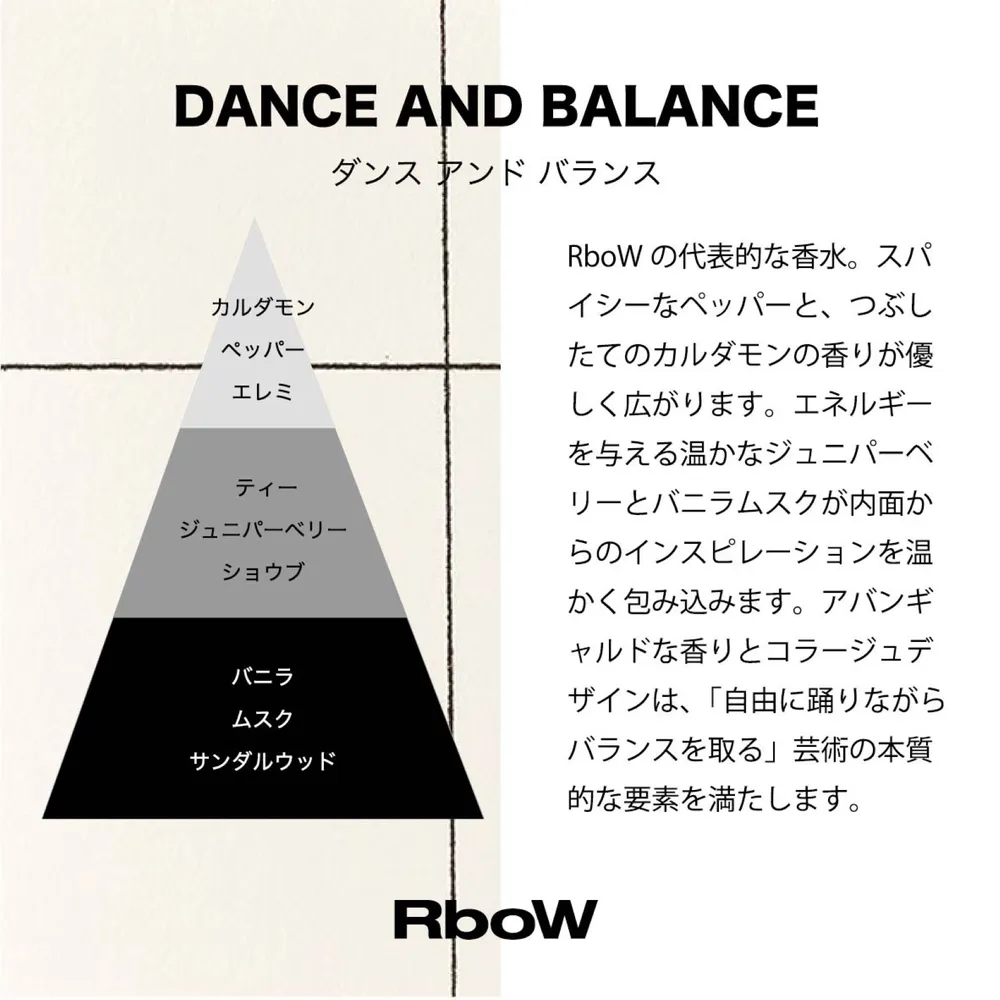 RboWの代表的な香水です。スパイシーなペッパーと、つぶしたてのカルダモン香りが優しく広がります。 エネルギーを与える温かなジュニパーベリーとバニラムスクが内面からのインスピレーションを温かく包み込みます。 アバンギャルドな香りとコラージュデザインは、「自由に踊りながらバランスを取る」芸術の本質的な要素を満たします。