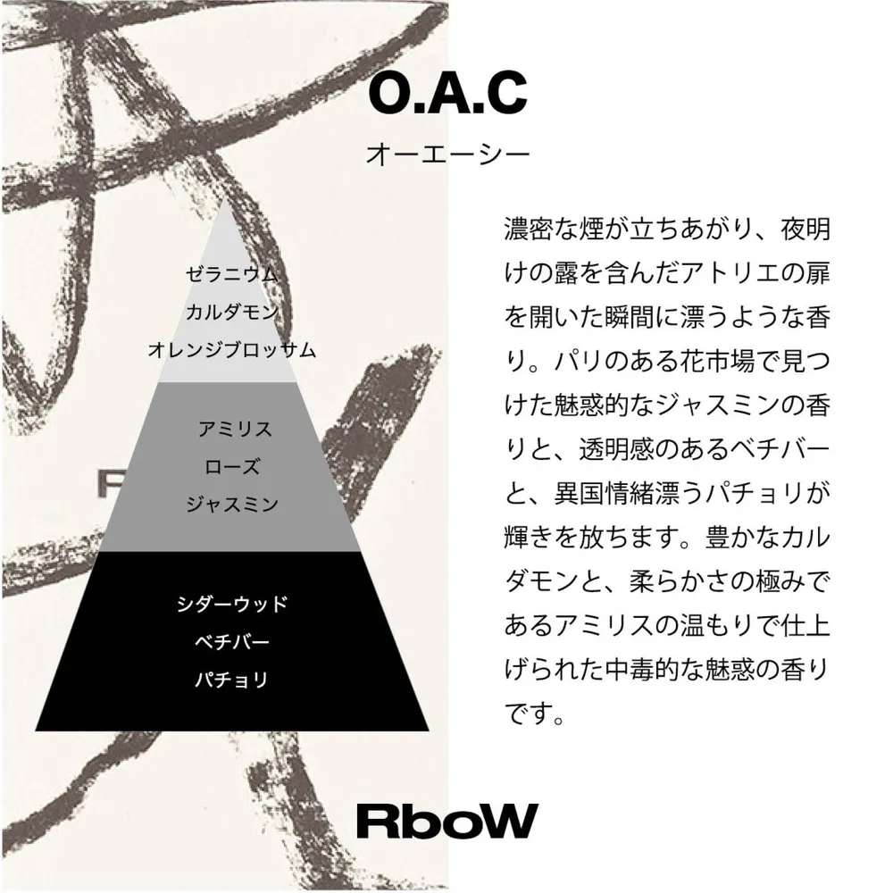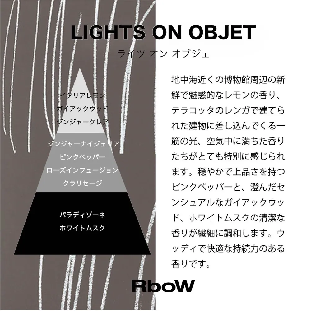 大口注文・法人のお問い合わせはこちら独創的でアヴァンギャルドな調香師らとのコラボレーションは、まさにRboWが追求するアートそのものです。 3つの香りは個性的ながらも洗練され、安らげる香りです。 ケーススタディというコンセプトは、アートの考察を元に、ラベル、パッケージにデザインされています。