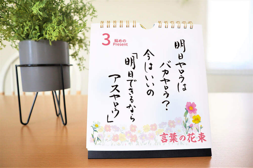 日めくりカレンダーに登場する【言葉】は 31種類の書きおろしです。 共感したり「ほっ」と安心できたり、 背中を押されたり、ときには涙が出てしまうものも……。