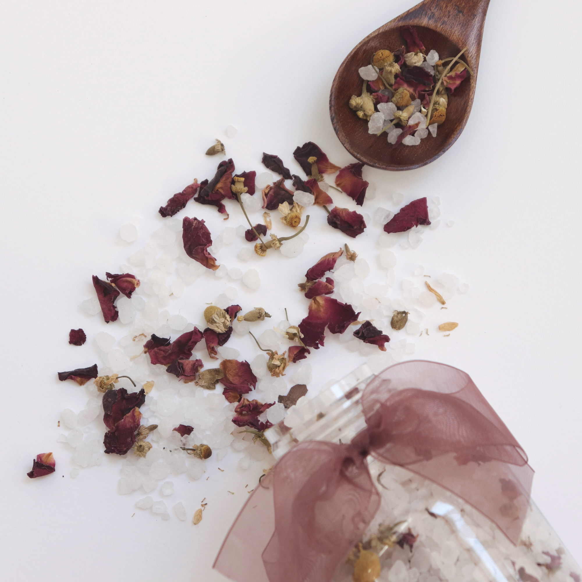 大口注文・法人のお問い合わせはこちら海塩にドライハーブをブレンドした色鮮やかなバスソルト。 ゴージャスなローズの花びらと可憐なカモミールジャーマンのハーブが、バスタイムを華やかに彩ります。
