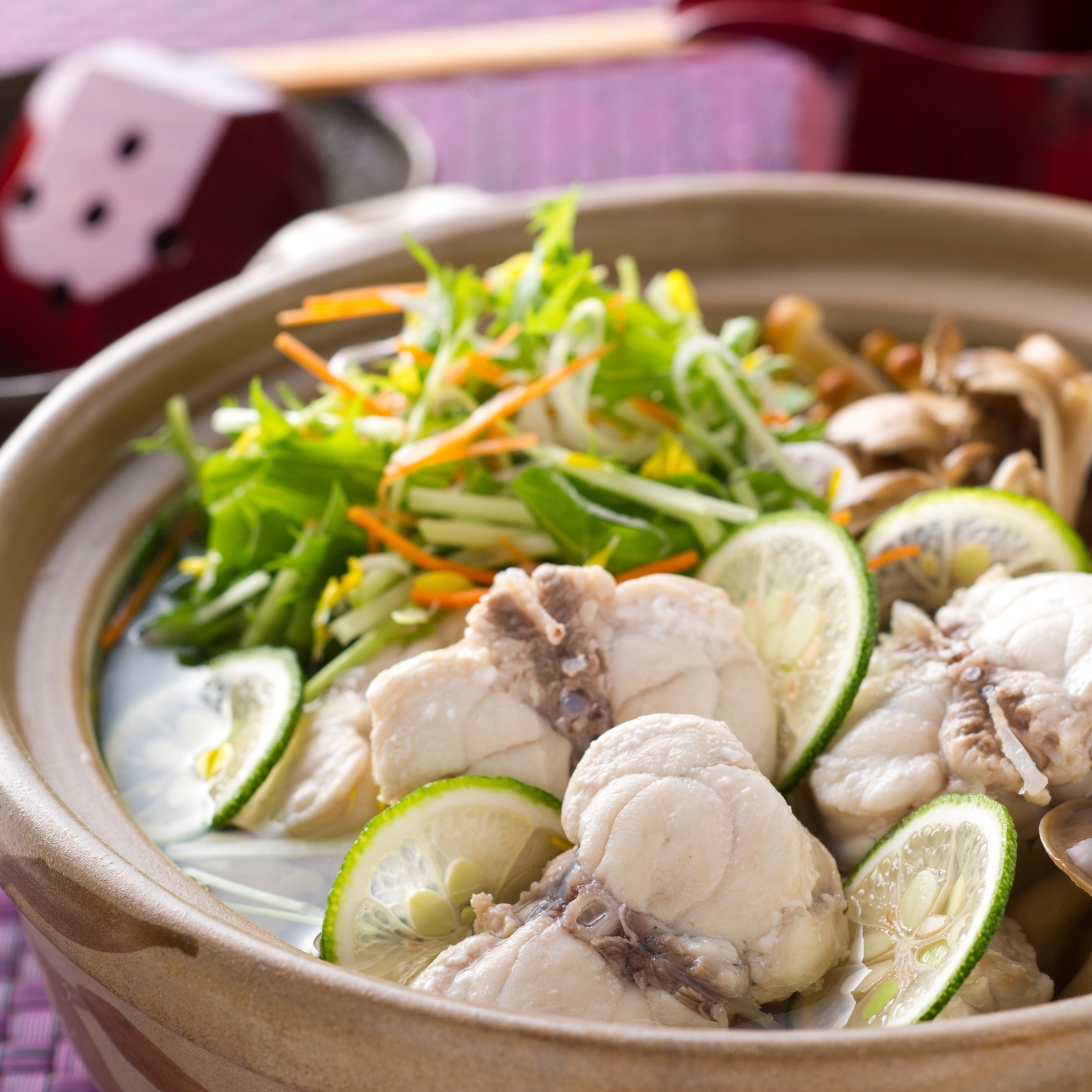 浜田漁港内にある加工施設で安全に下処理されたフグを使用。 魚介醤油ベースの鍋の素付きです。