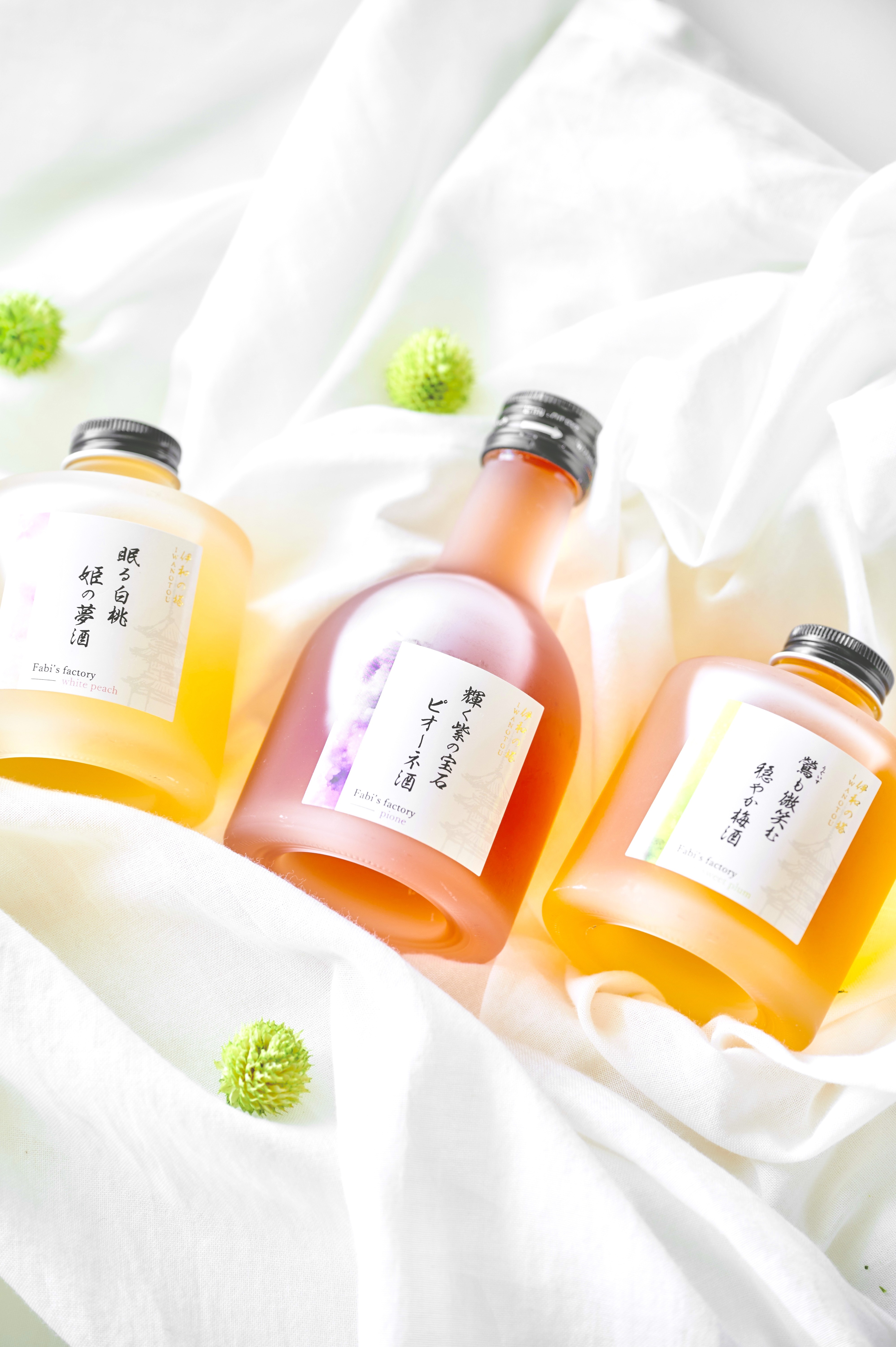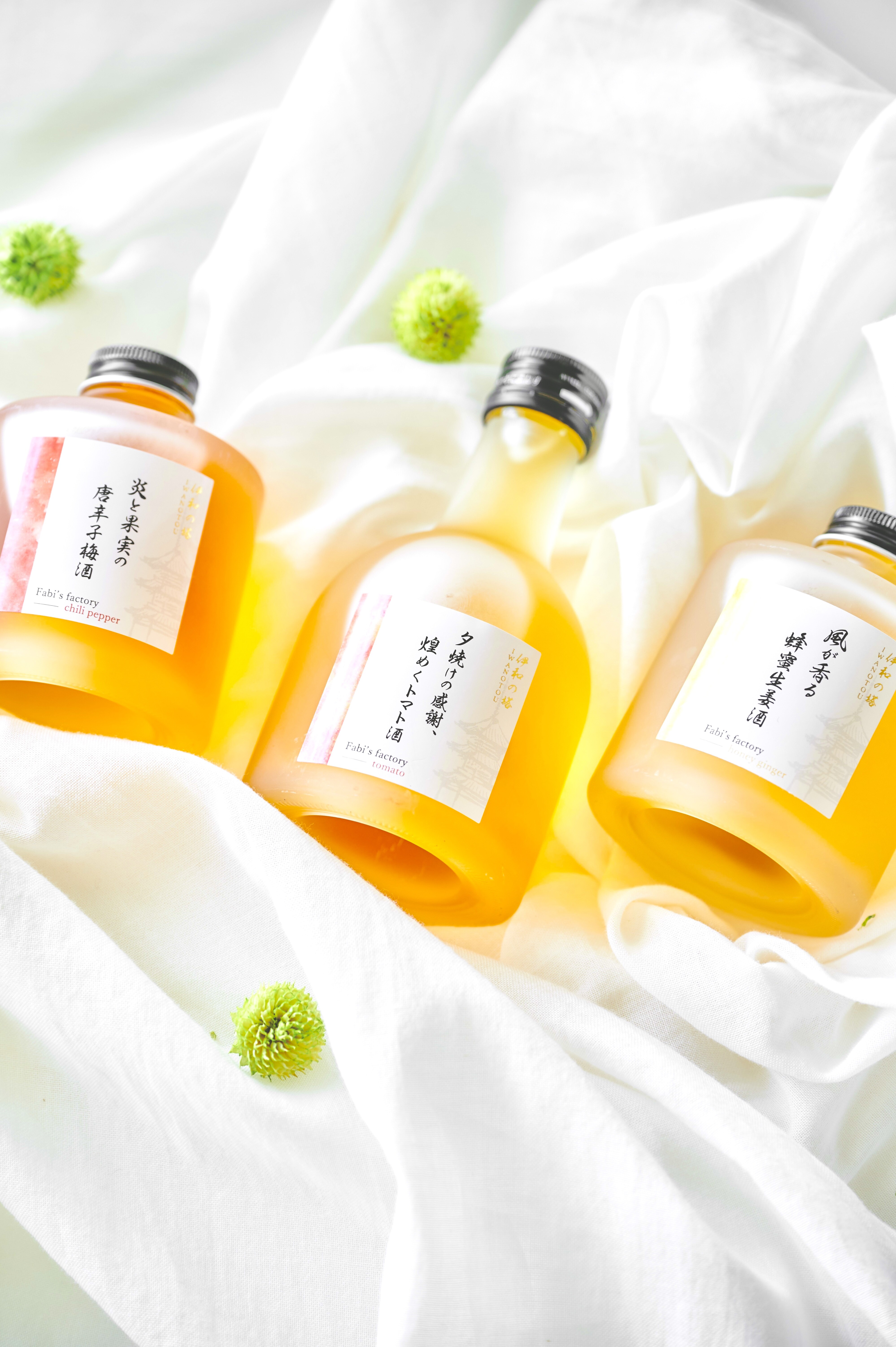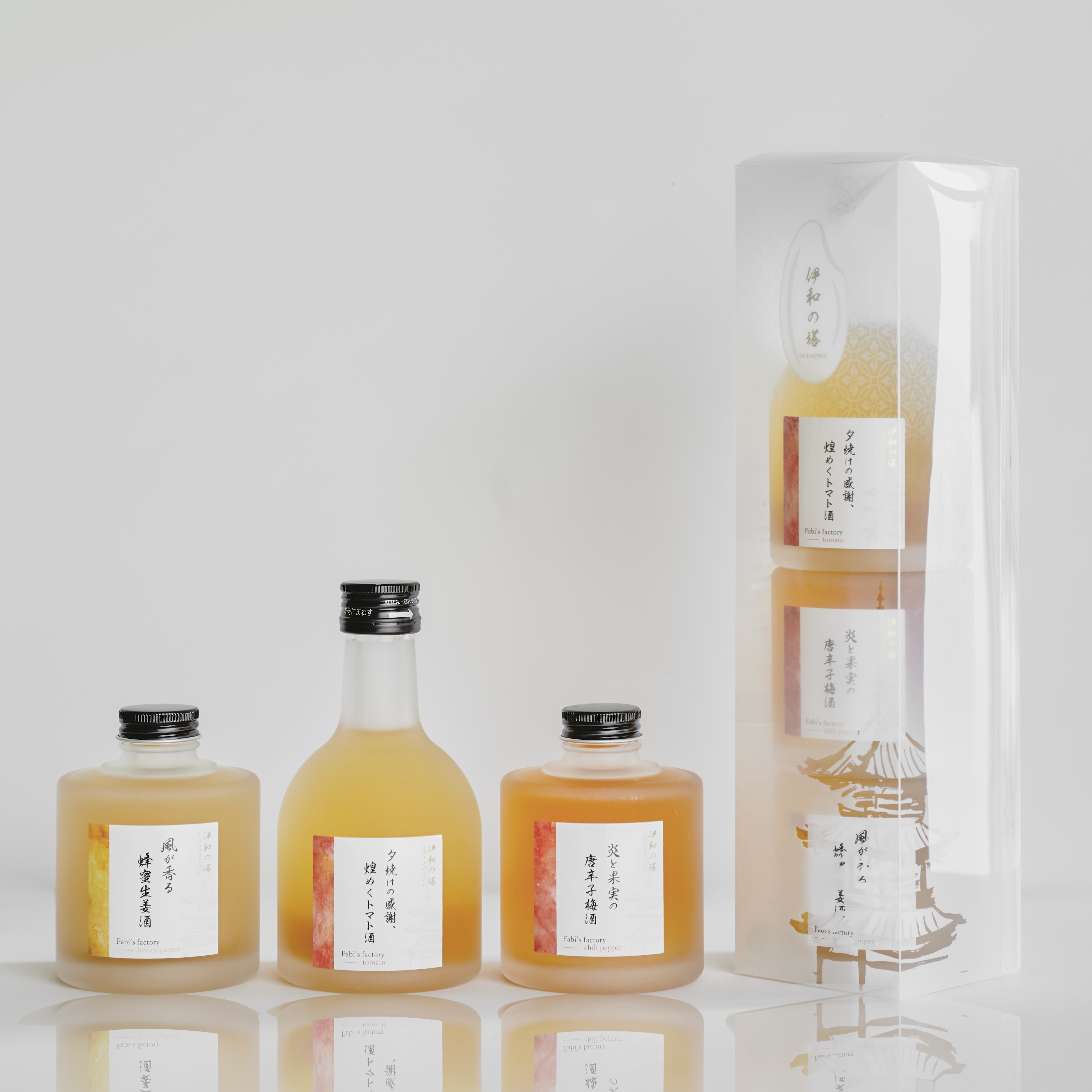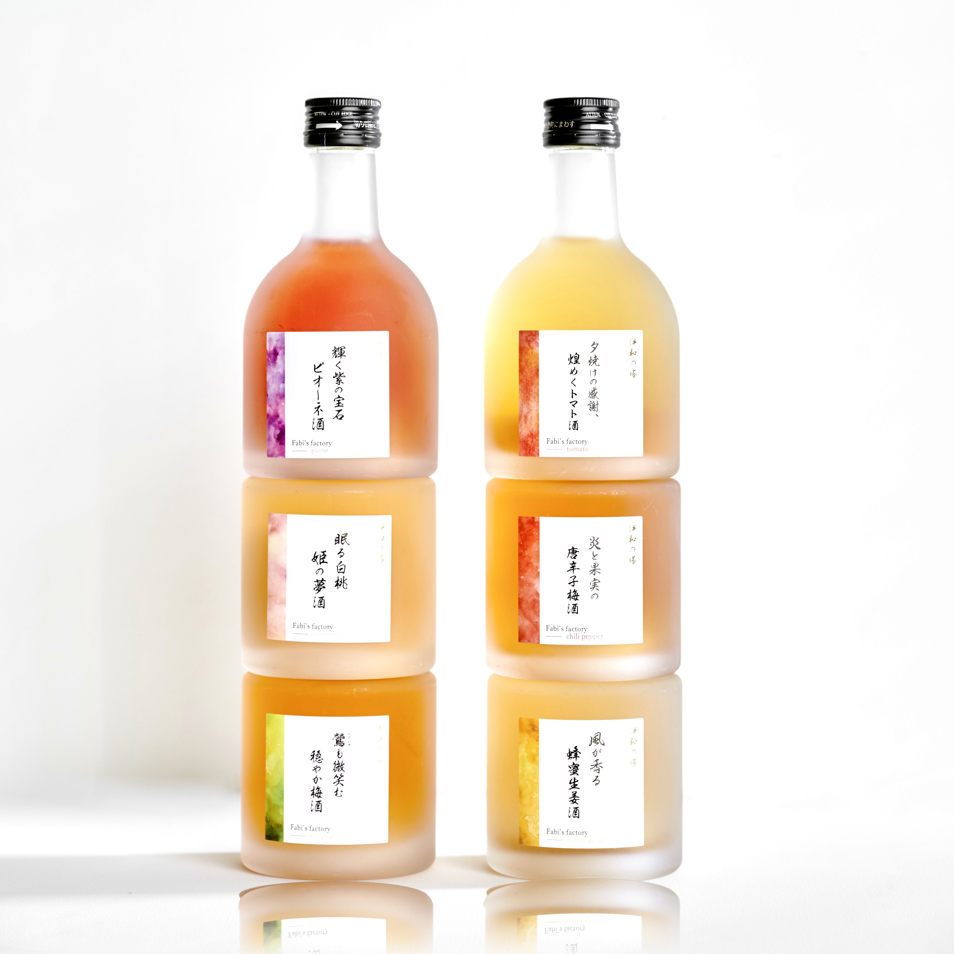 | 原材料 | ■トマト酒・唐辛子梅酒・蜂蜜生姜酒 清酒、梅(国産)、氷砂糖、一味唐辛子(国産姫とうがらし)、米焼酎、トマト(国産)、糖類、生姜汁(国産)、蜂蜜/ビタミンC、クエン酸、増粘剤(ペクチン) ■ピオーネ酒・白桃姫の夢酒・梅酒 連続蒸留焼酎(国内製造)、ピオーネ(国産)、清水白桃(国産)、氷砂糖、清酒、梅(国産古城)/クエン酸、ビタミンC |