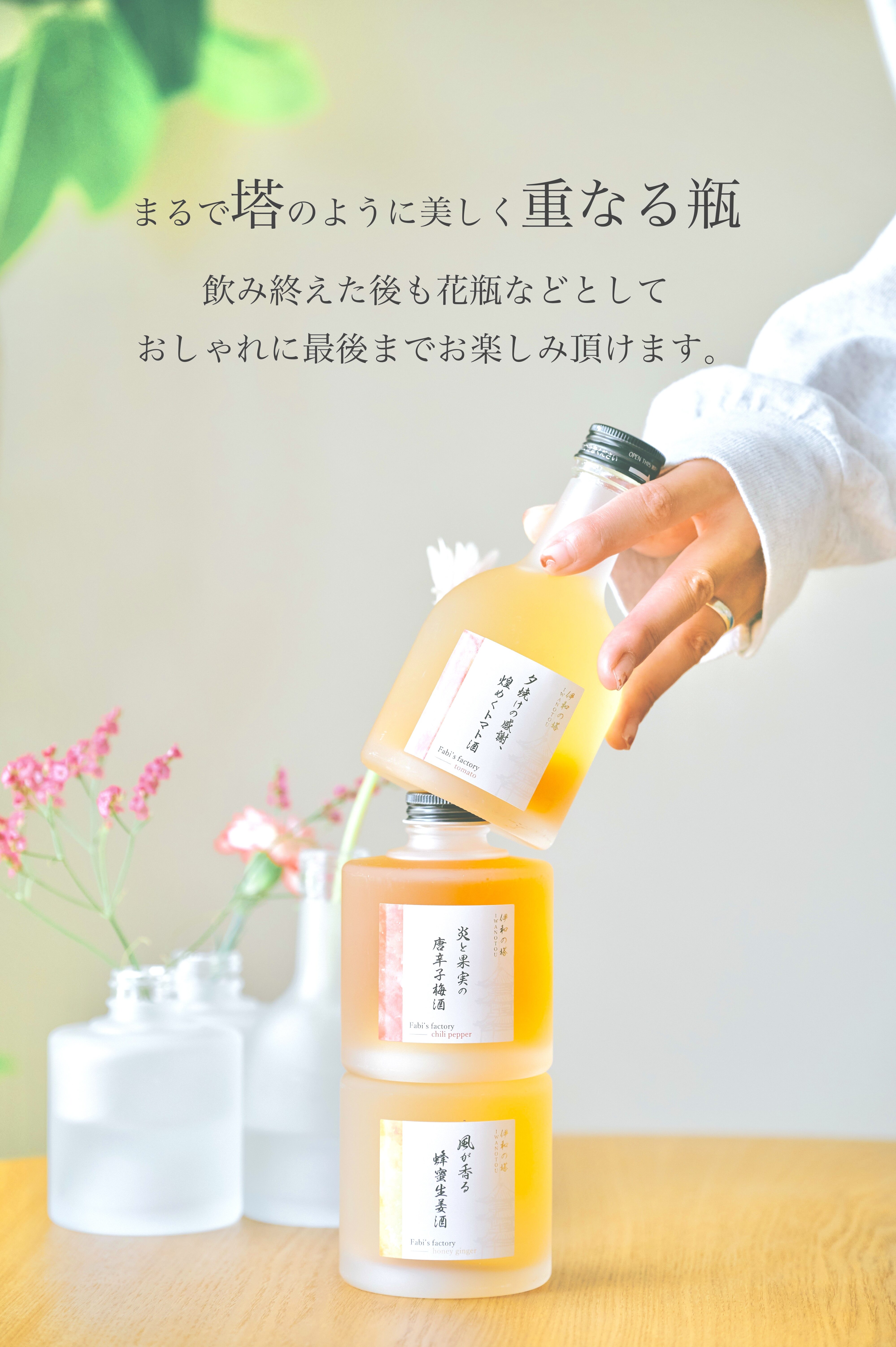 大口注文・法人のお問い合わせはこちら銀座イタリアンファビズがお届けする特別なリキュール『伊和の塔』。 名前の由来は「伊」はイタリア、「和」は日本を象徴しています。 国産原料にこだわり香料や着色料を一切使用せず、イタリアのエッセンスと日本のテイストを融合させた一級品です。自然な風味を引き立てたリキュールは 、まるで二つの文化が出会う瞬間を味わうかのような体験を提供します。 3段スタッキングのリキュールで贈り物に最適な1本 。贈る喜び、贈られる喜びを。