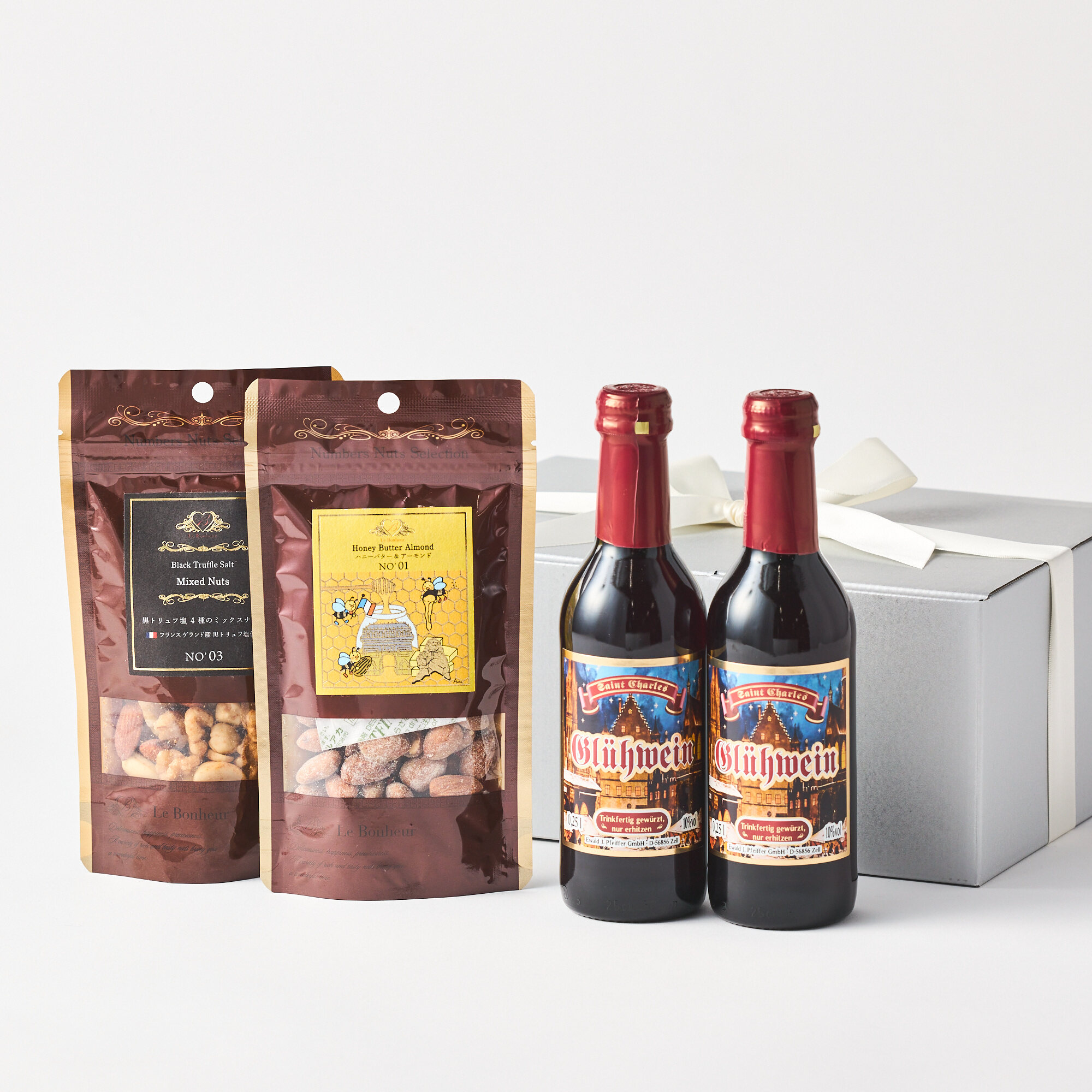 スパイスやフルーツを加えたほんのり甘いグリューワインとおつまみのギフトセットです。