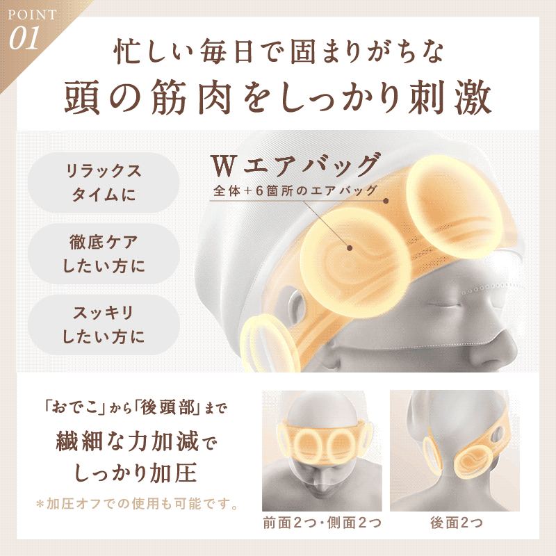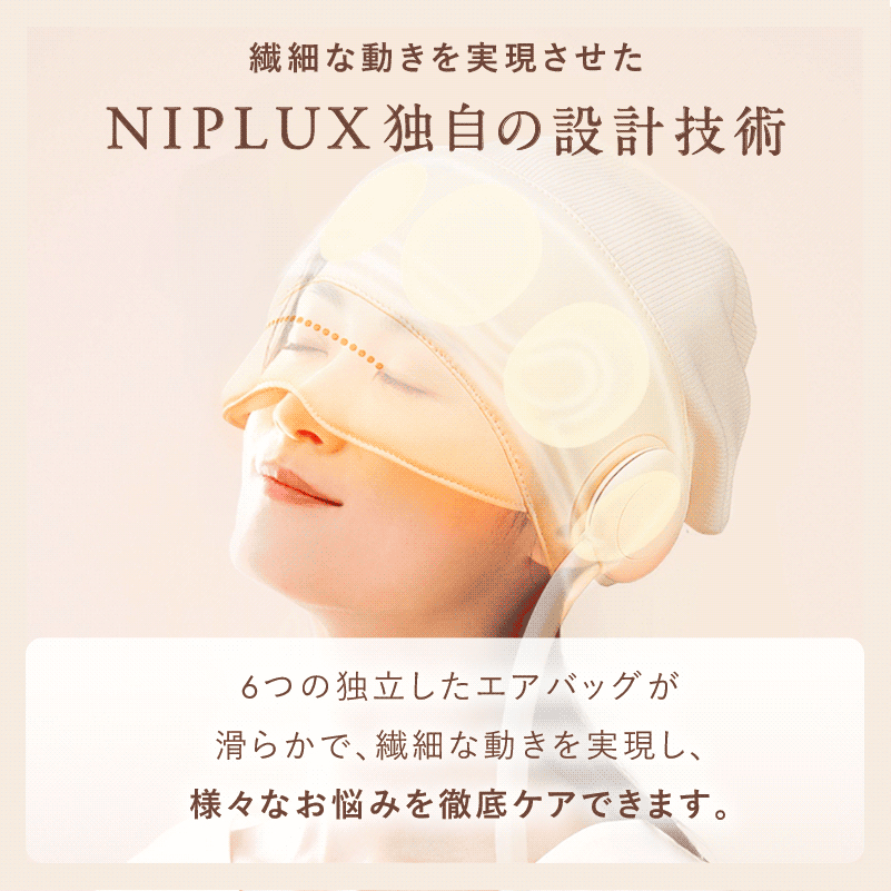 6つの独立したエアバックが滑らかで繊細な動きを実現し、エアの力で360度包み込みます。簡単な操作でその日の気分で4つのモードからリラックス設定を選べ、優れた熱伝導の力で目元を心地よくあたためます。