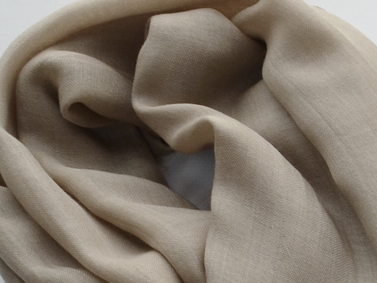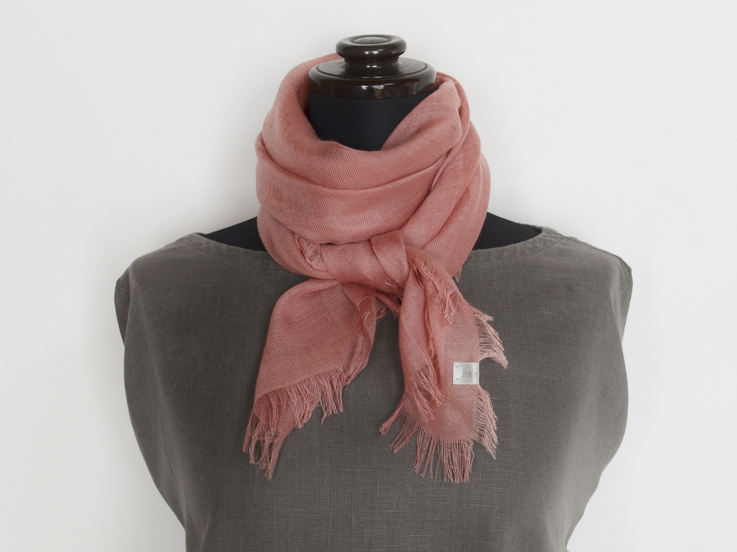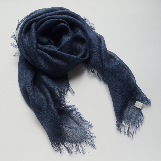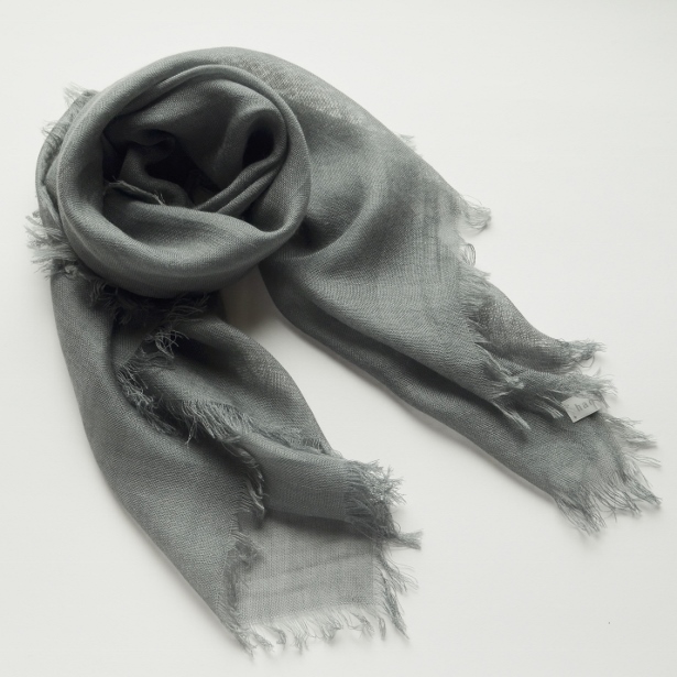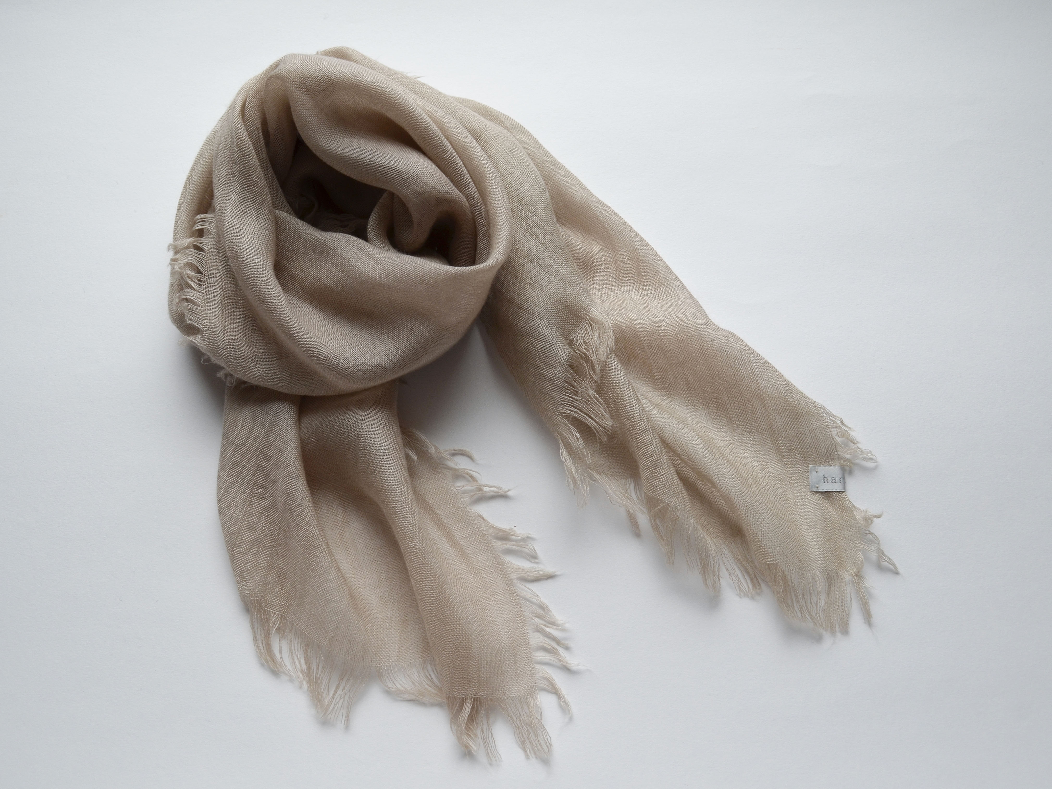 海外で生産されることの多いストールですが、この製品は糸作りからの日本生産。 輸入した原料をまず長崎で糸にし、次に浜松で糊づけ、そして東京八王子で織って、染色は山梨は富士の麓で。 その後東京に戻って、最後は世田谷のわが社で一枚ずつ丁寧に仕上げます。