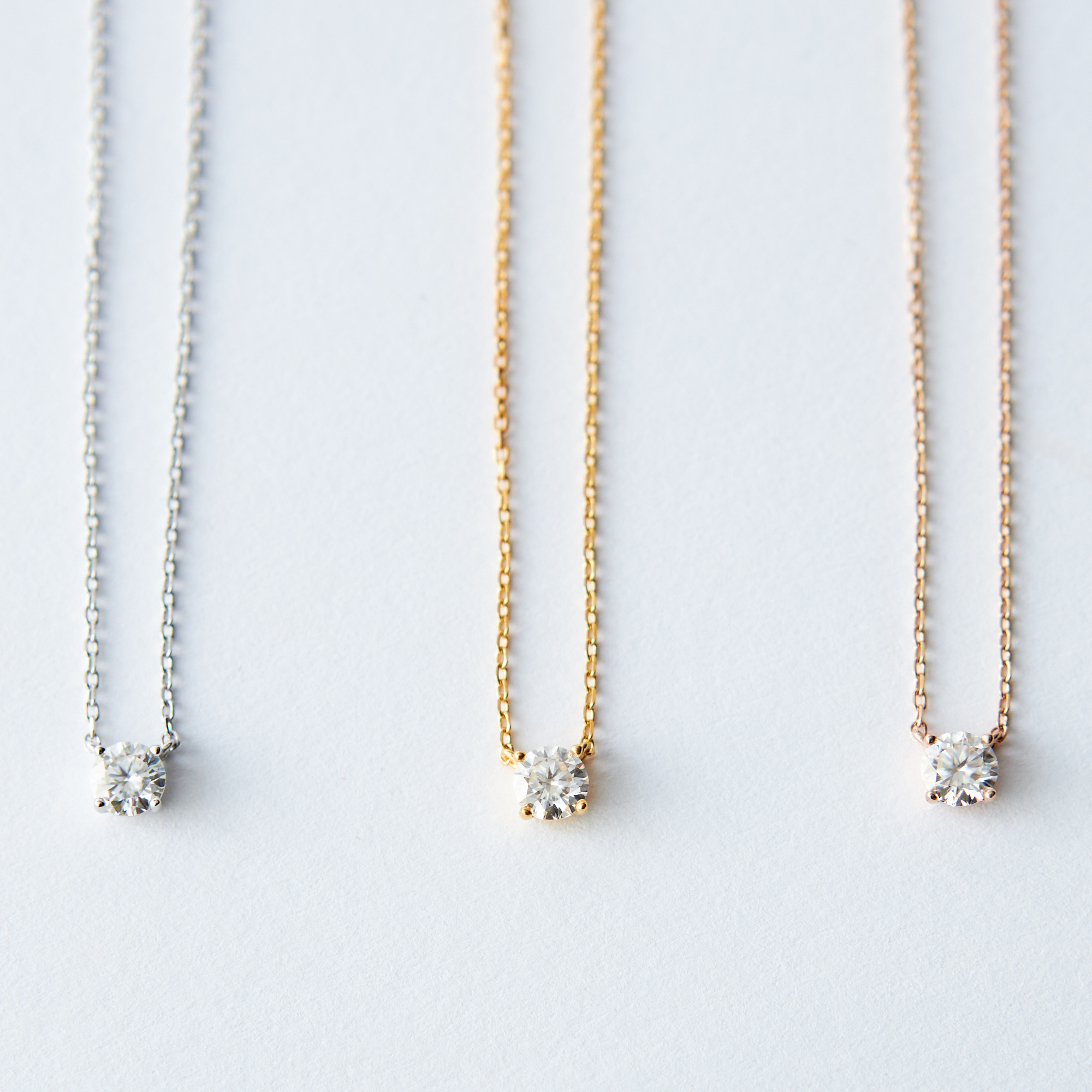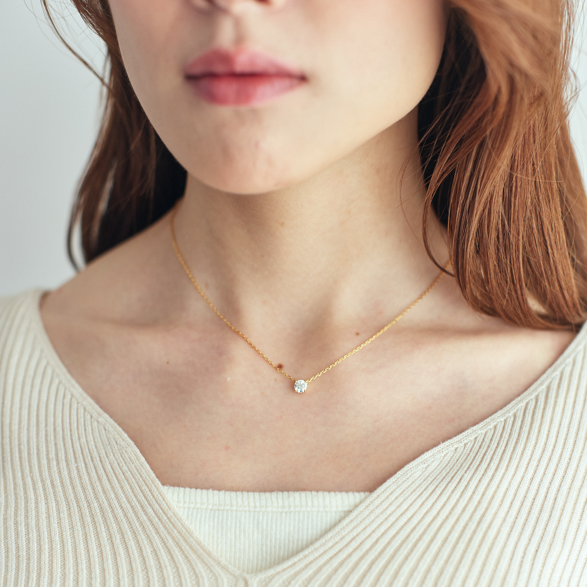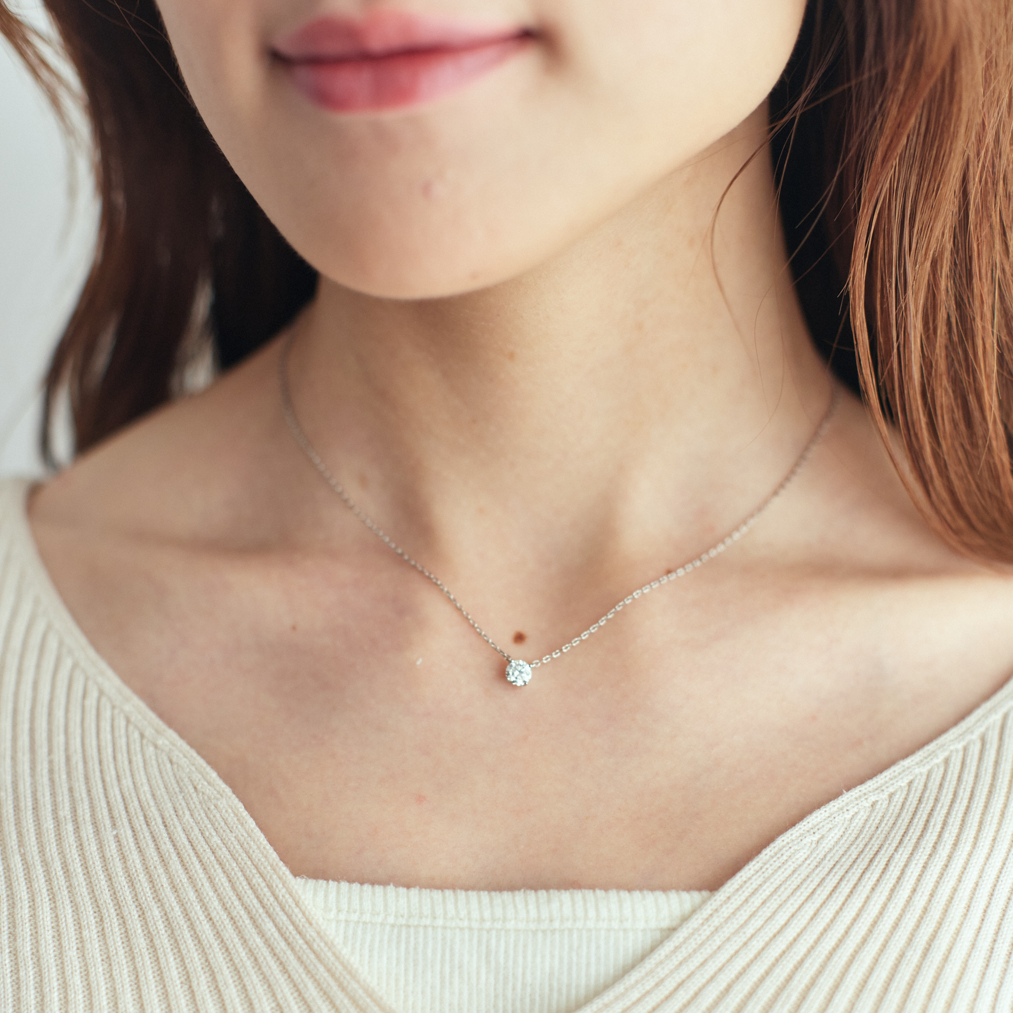 0.5カラット相当のラウンド型モアサナイトを使用した一粒ネックレス。 シンプルで上品なデザインと高級感でシーンや年齢を選ばないため、長くお使いいただけるアイテムです。