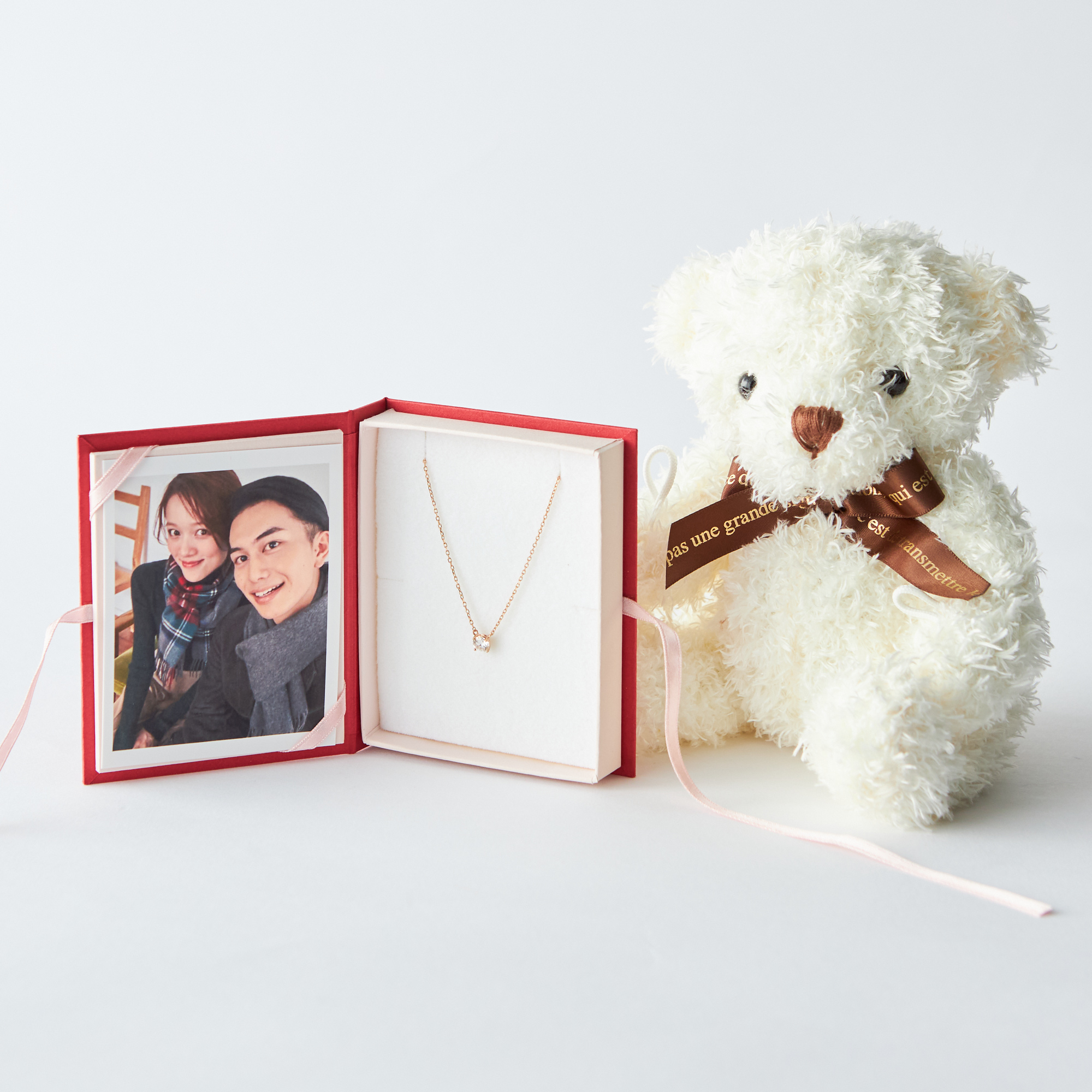 思い出の写真をパーソナライズできるボックス付きのモアサナイトが輝く一粒ネックレスとテディベアをセットにしました。