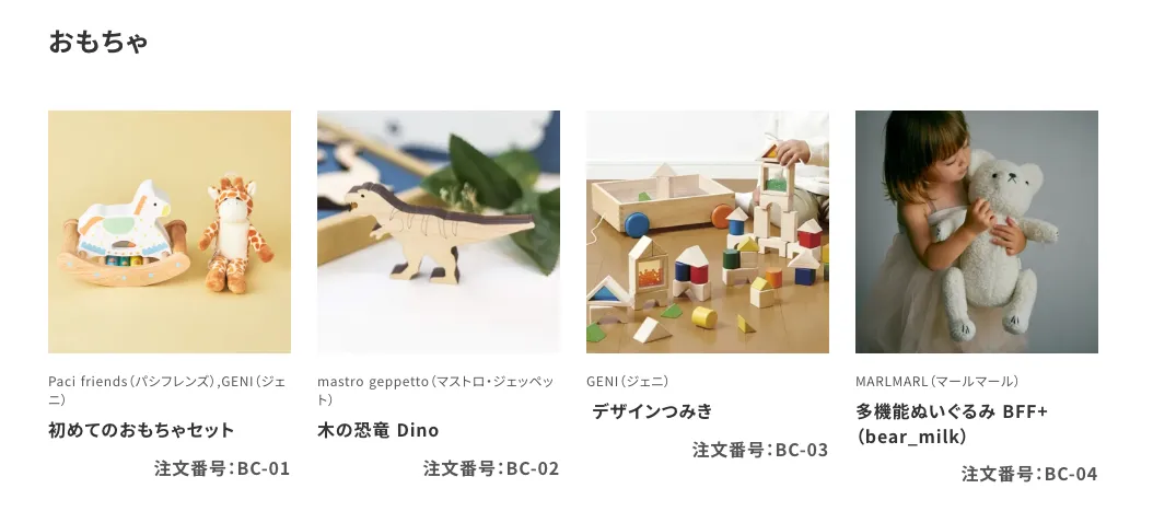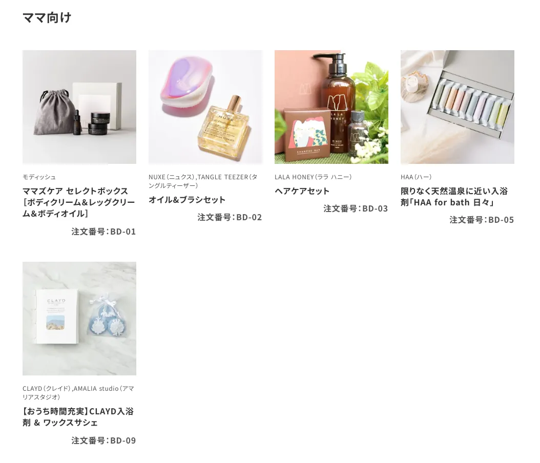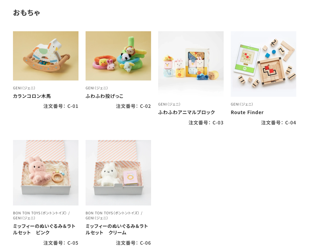 赤ちゃんが安心して使えるやさしい素材のベビーグッズや、 お母さんのためのケアアイテム、ご家族みんなで楽しめるグッズまで、 ギフト専門オンラインショップならではの幅広いラインナップをご用意いたしました。