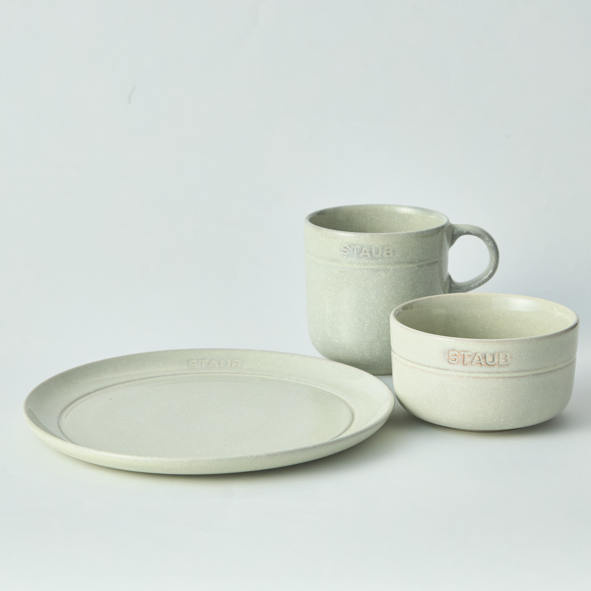 調理をしてそのままテーブルにサーブできる鍋が有名な「Staub(ストウブ)」から、マグカップとお皿の3点セットが登場。独自の風合いのナチュラルなカラーは、モダンから和食まで相性が良く、長くストウブをご愛用の方はもちろん、これからストウブを使い始める方にもおすすめです。