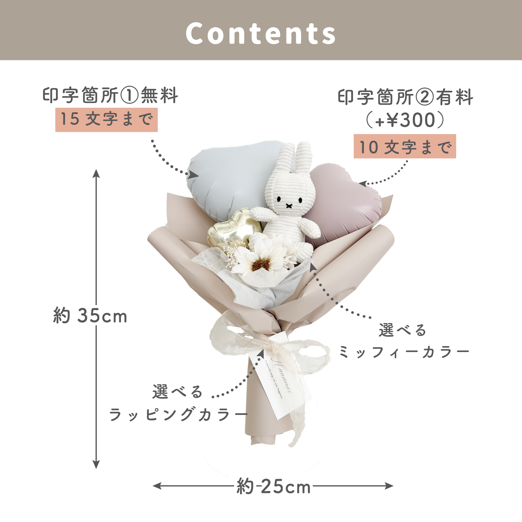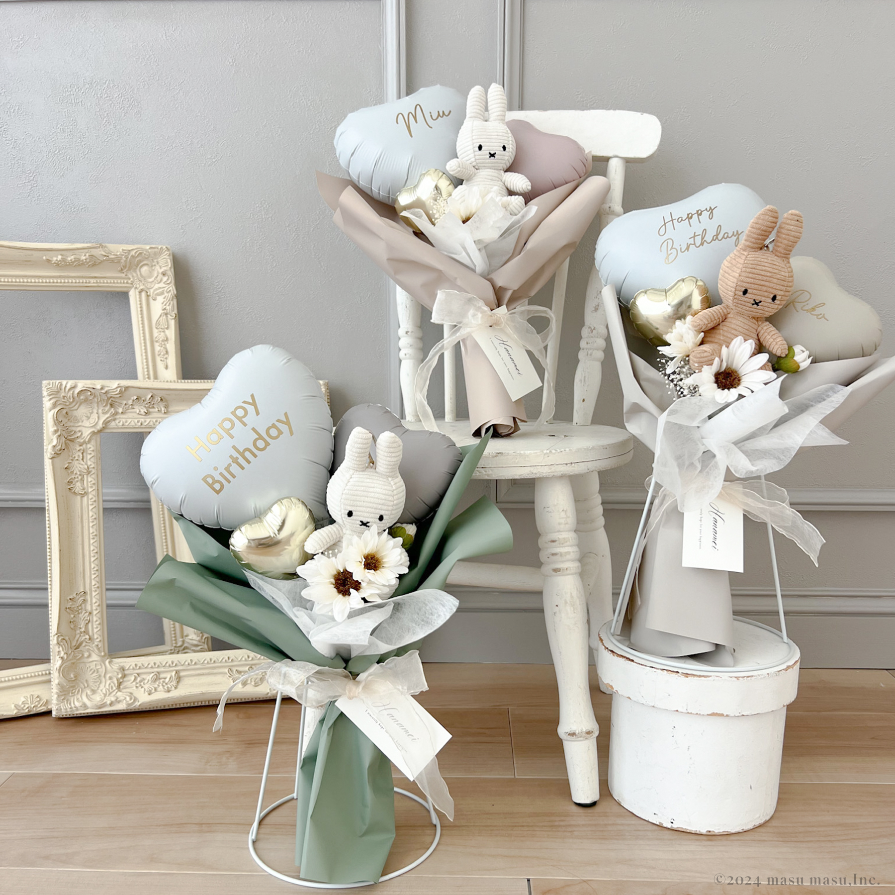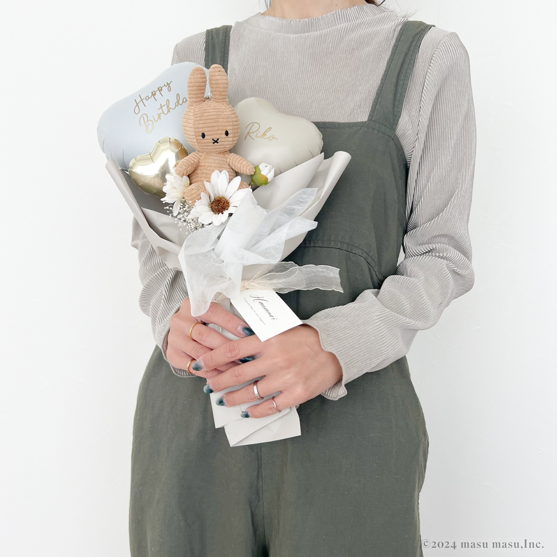大口注文・法人のお問い合わせはこちらミッフィーのキーチェーンが入った、とっても可愛いバルーンブーケ。 ミッフィーとラッピングはお好きなカラーをお選びいただけ、ハートバルーンにはお名前やお好きなお祝いフレーズなどのお入れができます。 そんなミッフィーのキーチェーンを添えたバルーンブーケはもらう人も贈る人も、笑顔になれるギフトです。