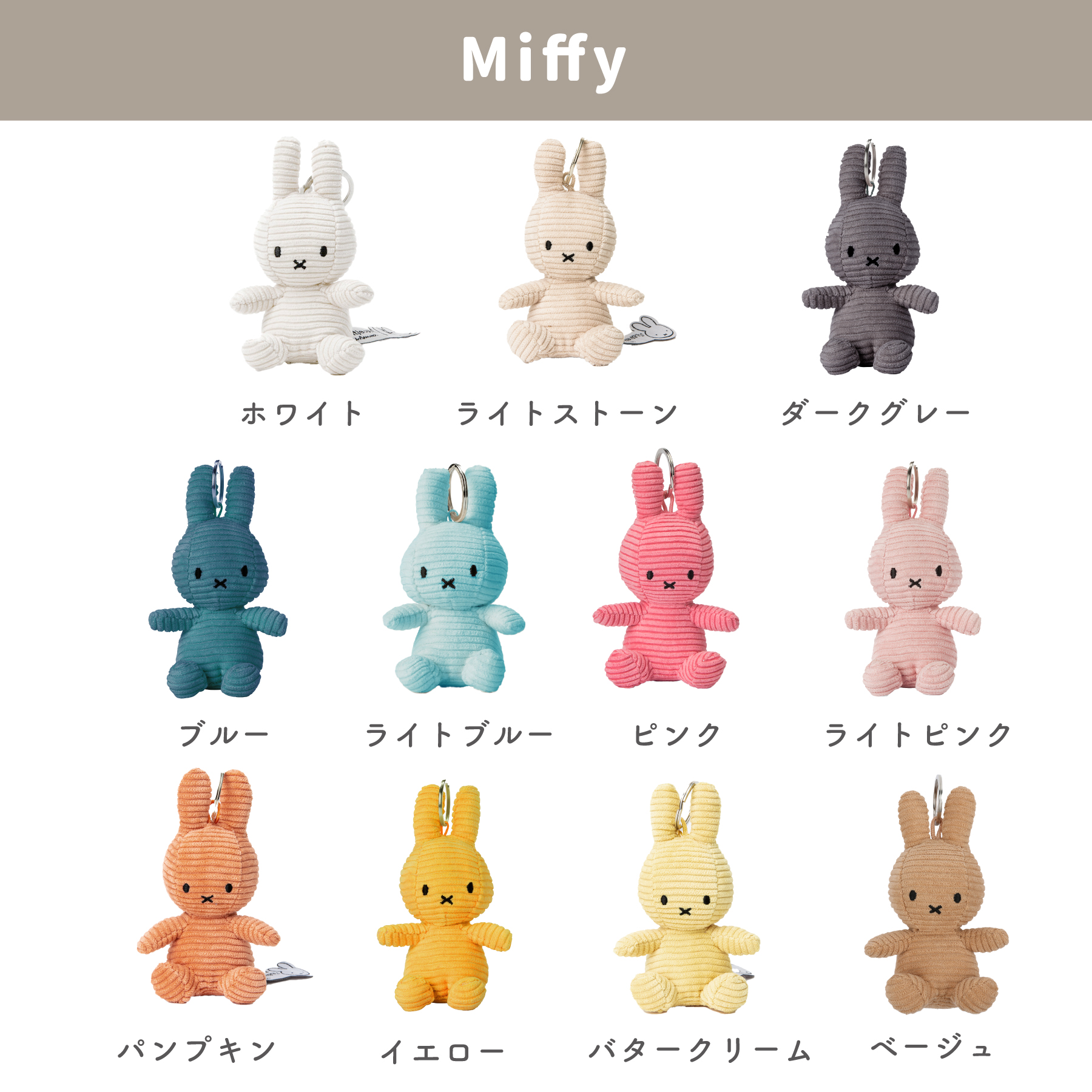 オランダのぬいぐるみメーカー「BON TON TOYS(ボントントイズ)」が作るミッフィーはコーデュロイ素材のあたたかみを感じるデザイン。 小さなミッフィーはキーチェンになっており、バルーン鑑賞後もお楽しみいただけます。