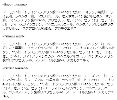 グレープフルーツ・ローズマリー・ラベンダー・レモングラスの香り 爽やかでほんのり甘いシトラス調の香りと爽快感のあるグリーンな香りをブレンド。 リフレッシュしたい日に。 『きのうまでの私にごほうびを、 あしたからの私に活力を。 バスタイムでゆったり、 さわやかな香りにつつまれながら 心も体もリフレッシュする週末。』