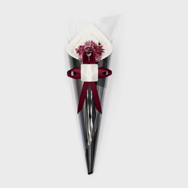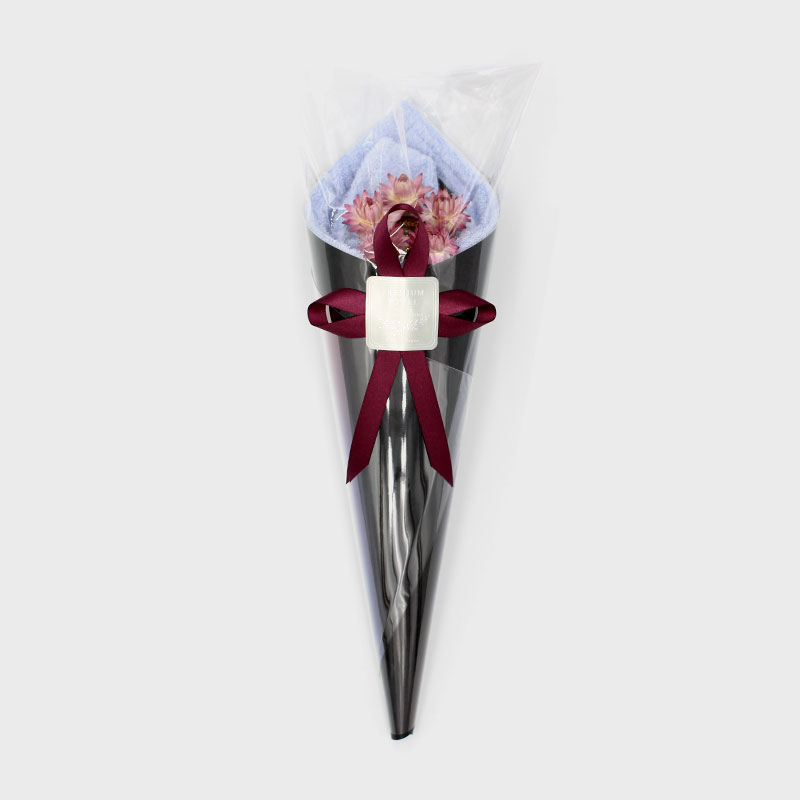 タオルに包まれている天然のドライフラワーは『エバーラスティング』。 エバーラスティングの花言葉は『永遠の思い出、不滅の愛、いつまでも続く幸せ』。 その名の通り、乾燥させても花びらの色を変えず、永遠に咲き誇るような美しさが特徴です。