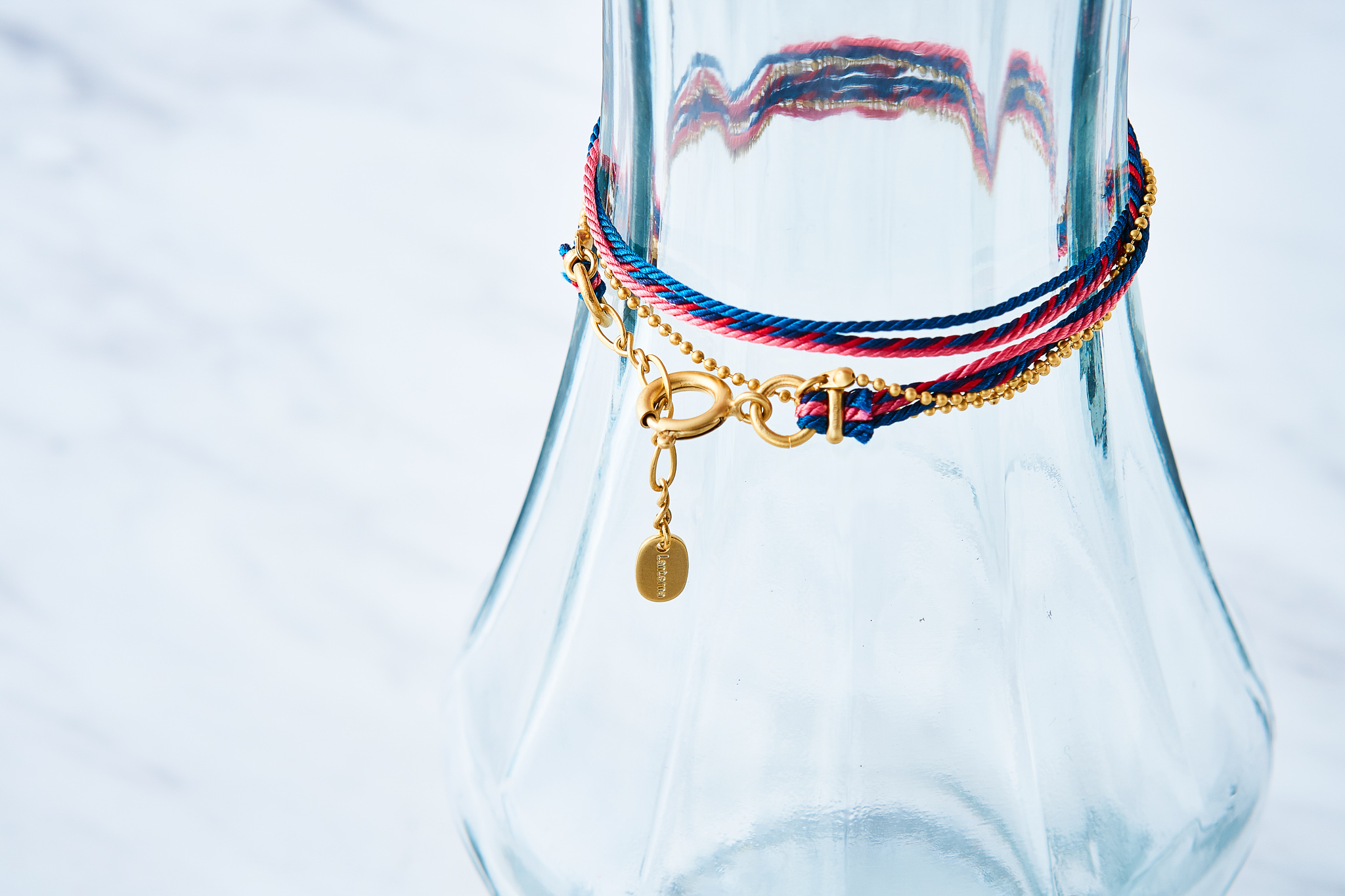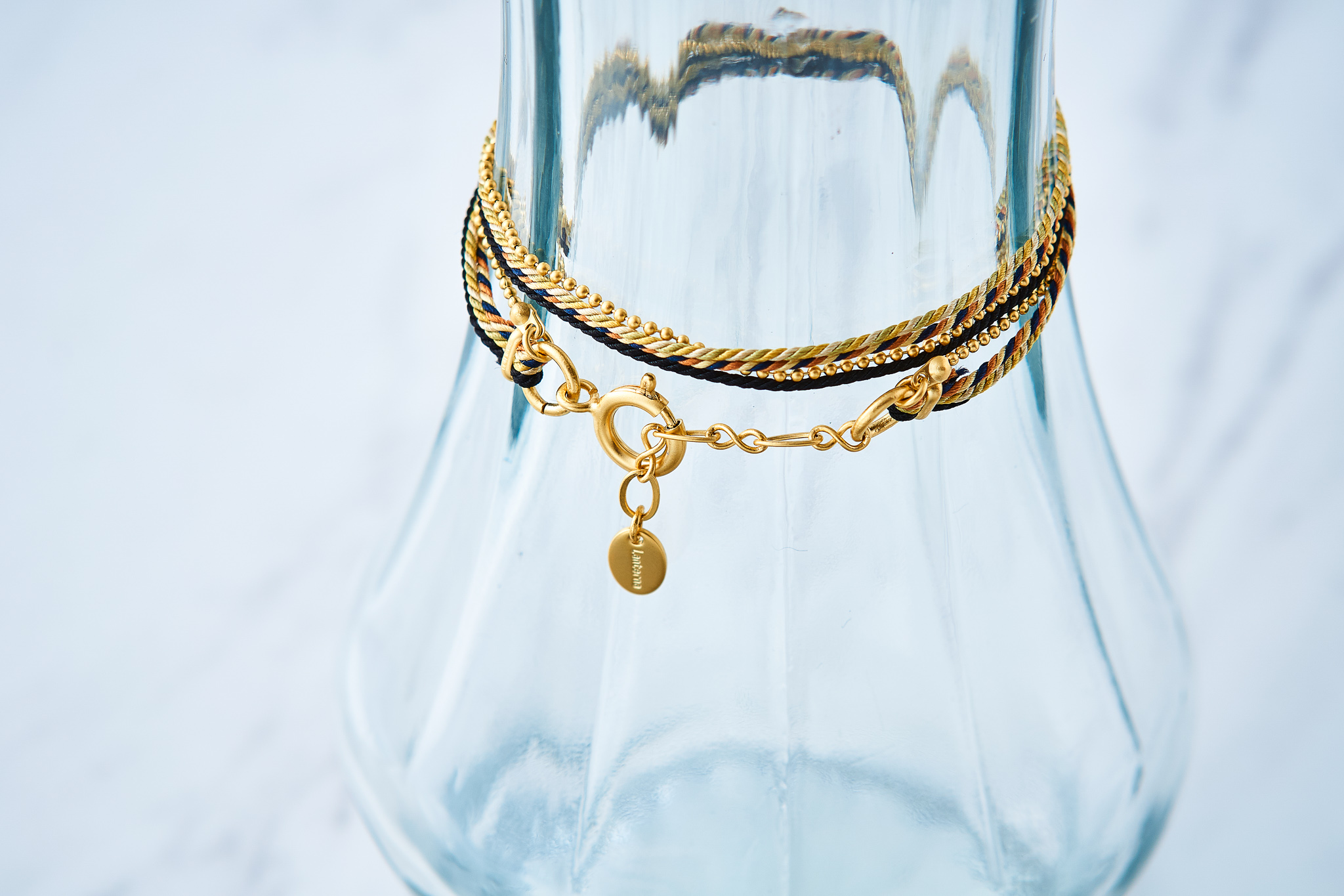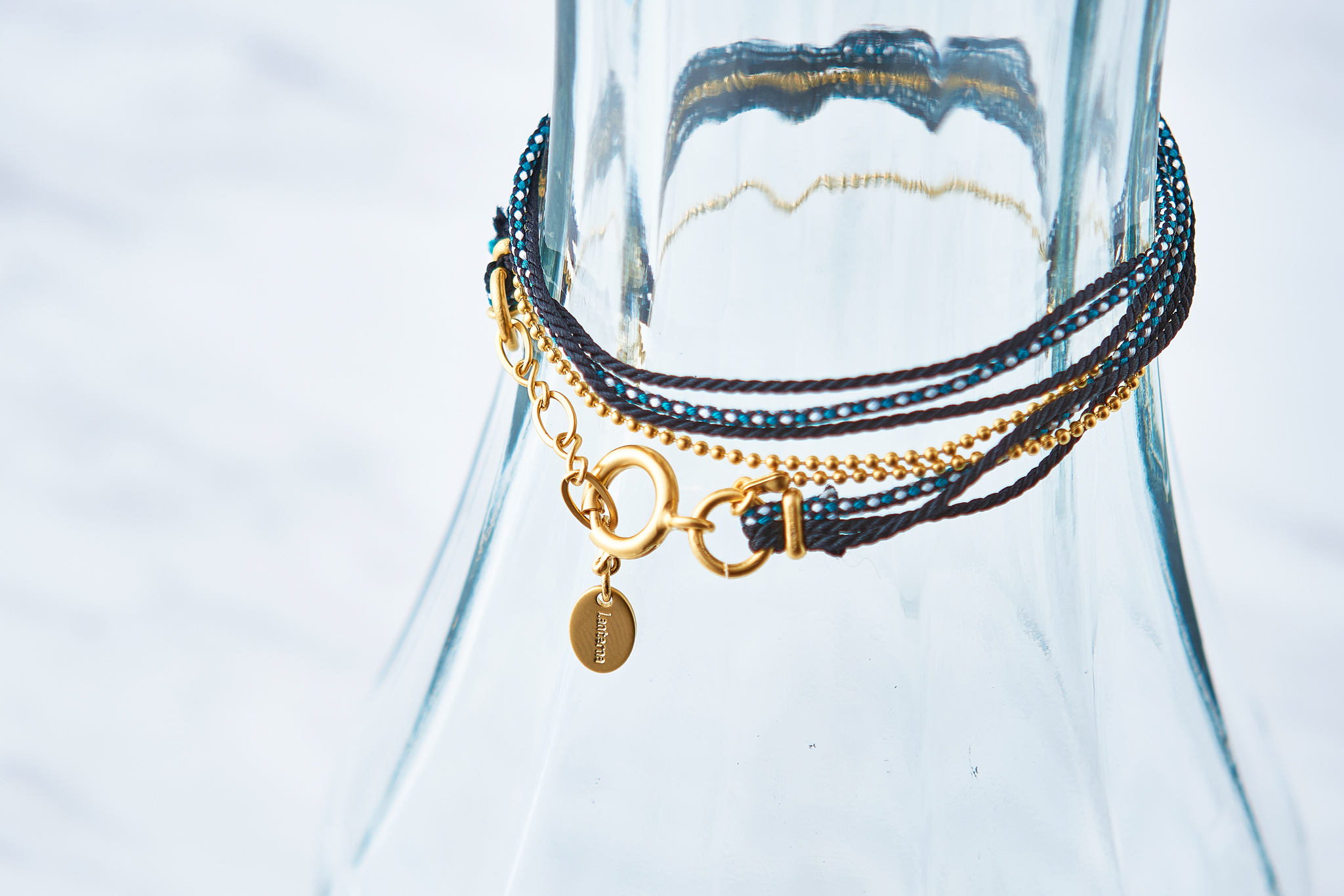 くみひもとボールチェーンのコンビブレスレットで、3本のくみひものツヤ感のある鮮やかなカラーを引き立てるソフトな光沢のマットゴールドのボールチェーンと組み合わせました。