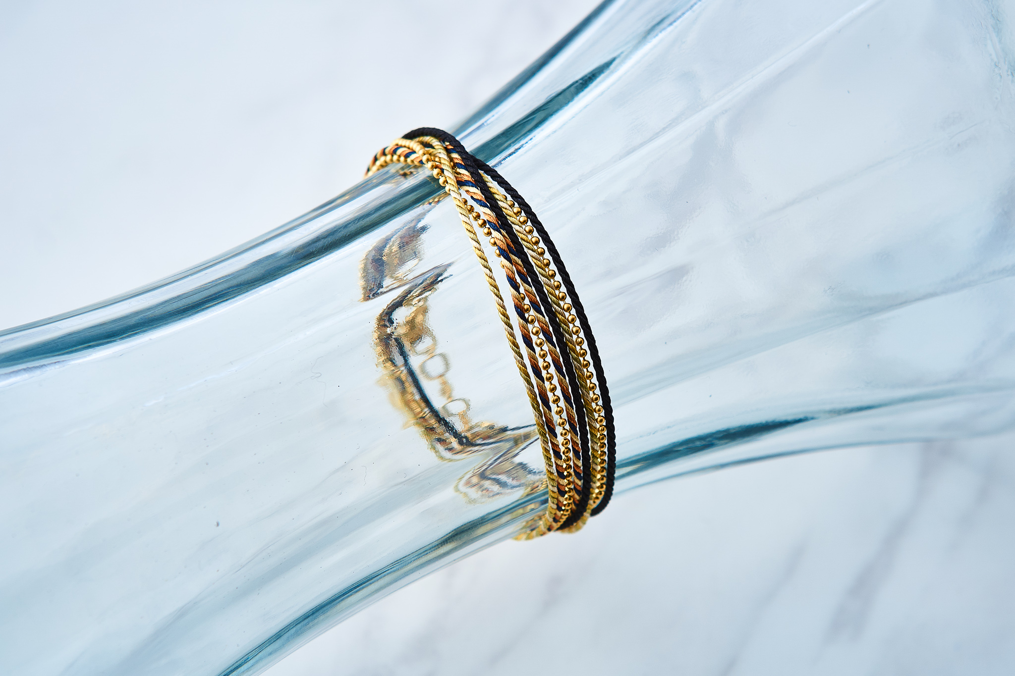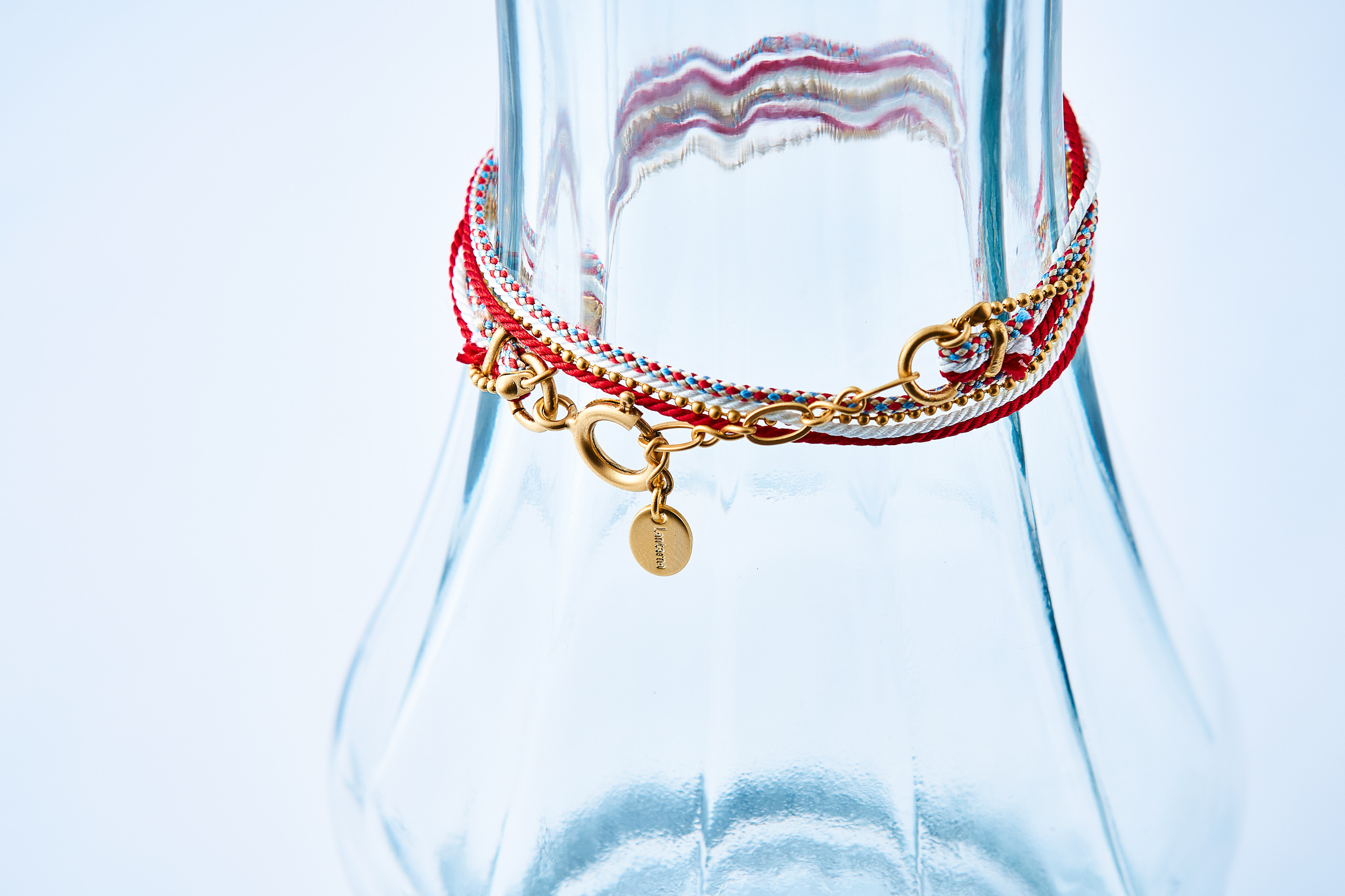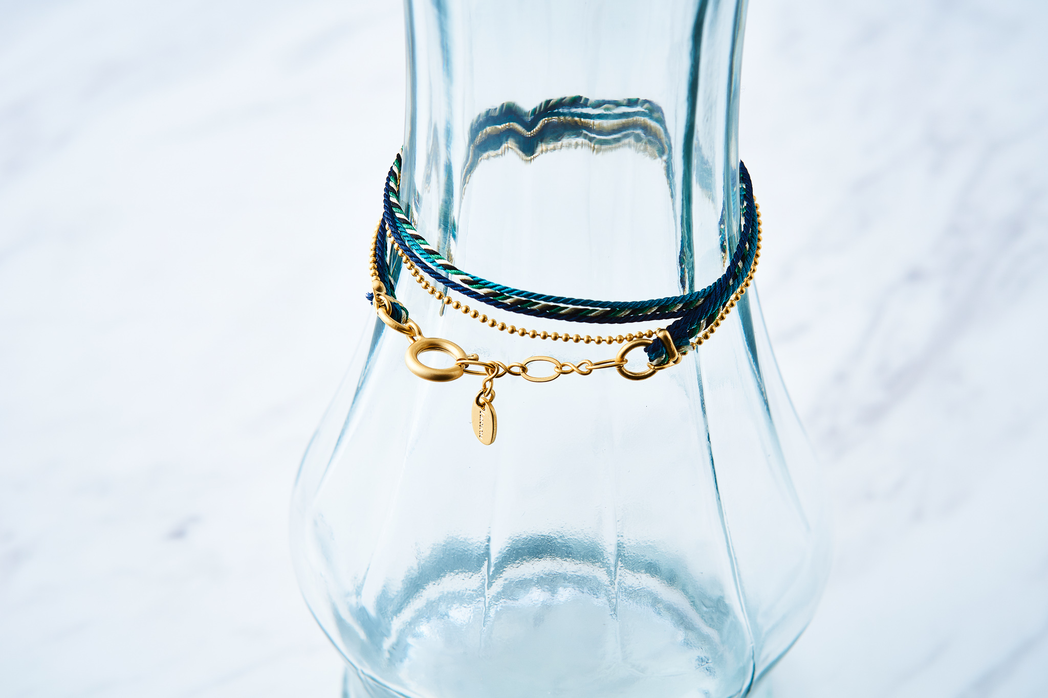 くみひもとボールチェーンのコンビブレスレットで、3本のくみひものツヤ感のある鮮やかなカラーを引き立てるソフトな光沢のマットゴールドのボールチェーンと組み合わせました。