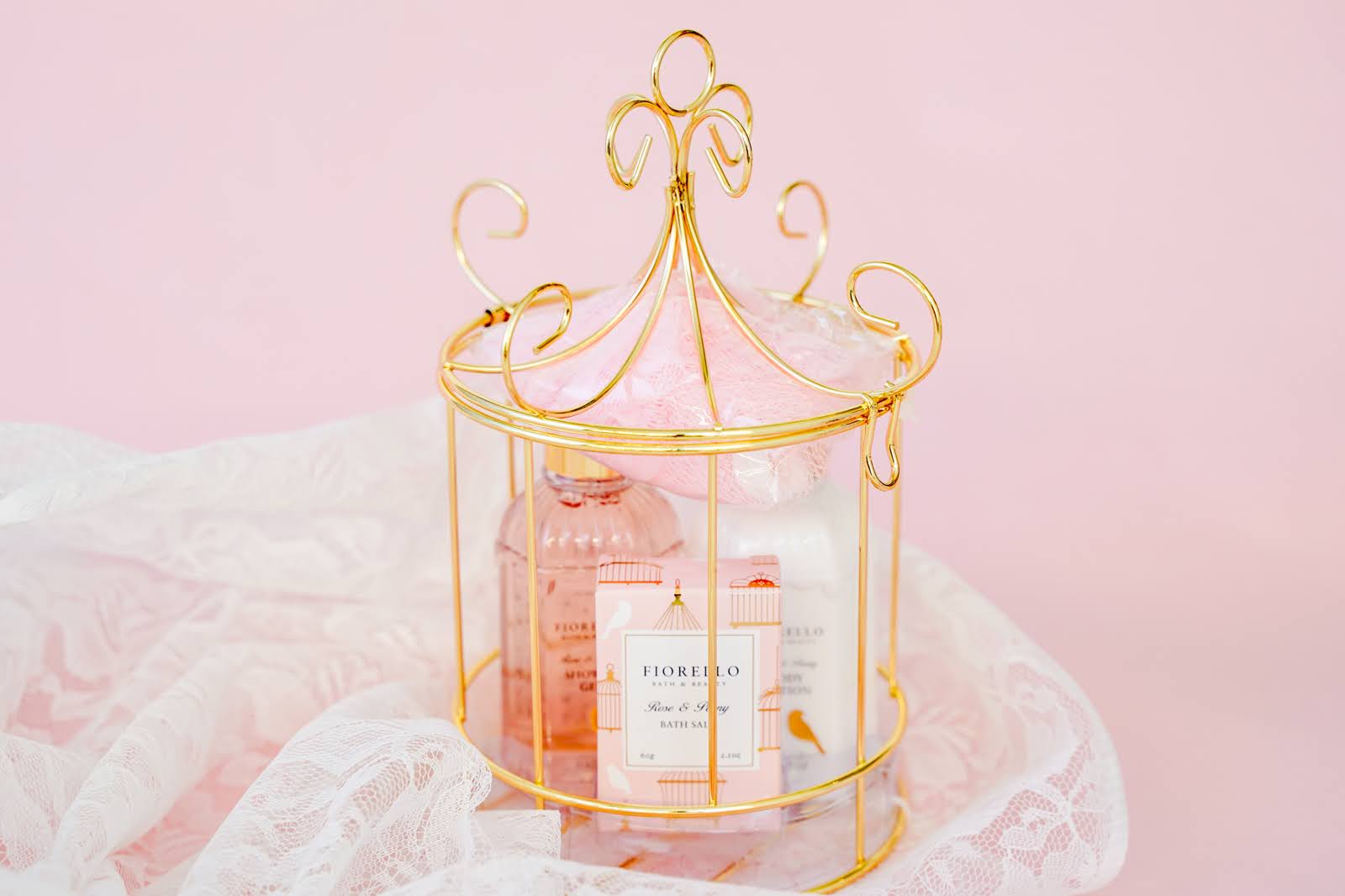 女性らしくメルヘンなデザインのFIORELLO ボディケアセットです。鳥かごをモチーフにして作られ、見た目もかわいく、少女のような乙女心をくすぐるデザインです。強すぎず甘くなりすぎないローズ&ピオニーの香りです。