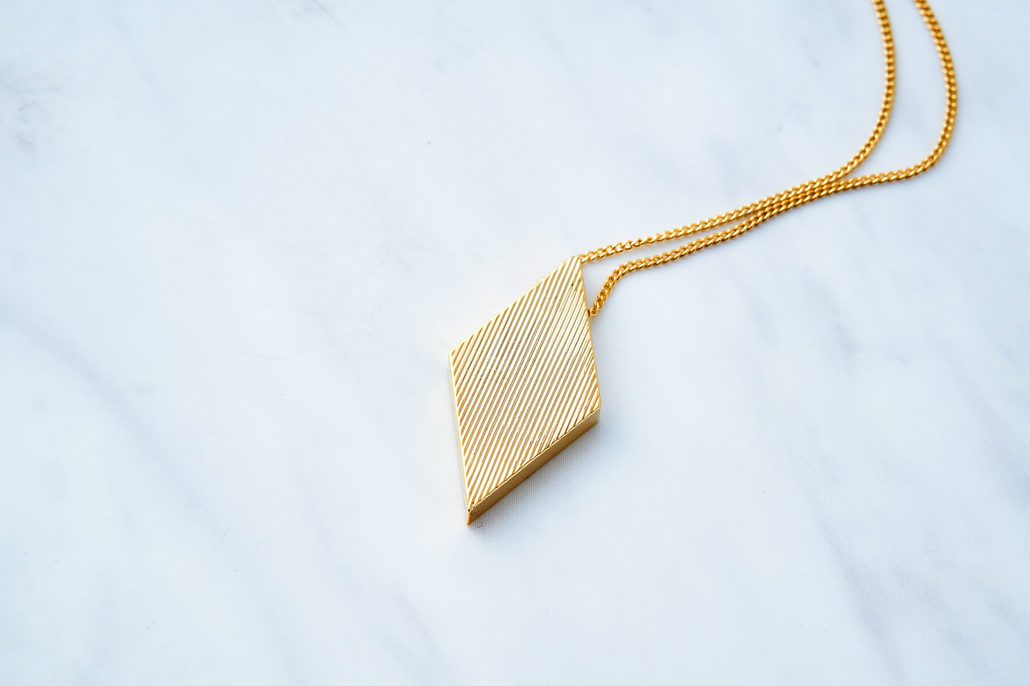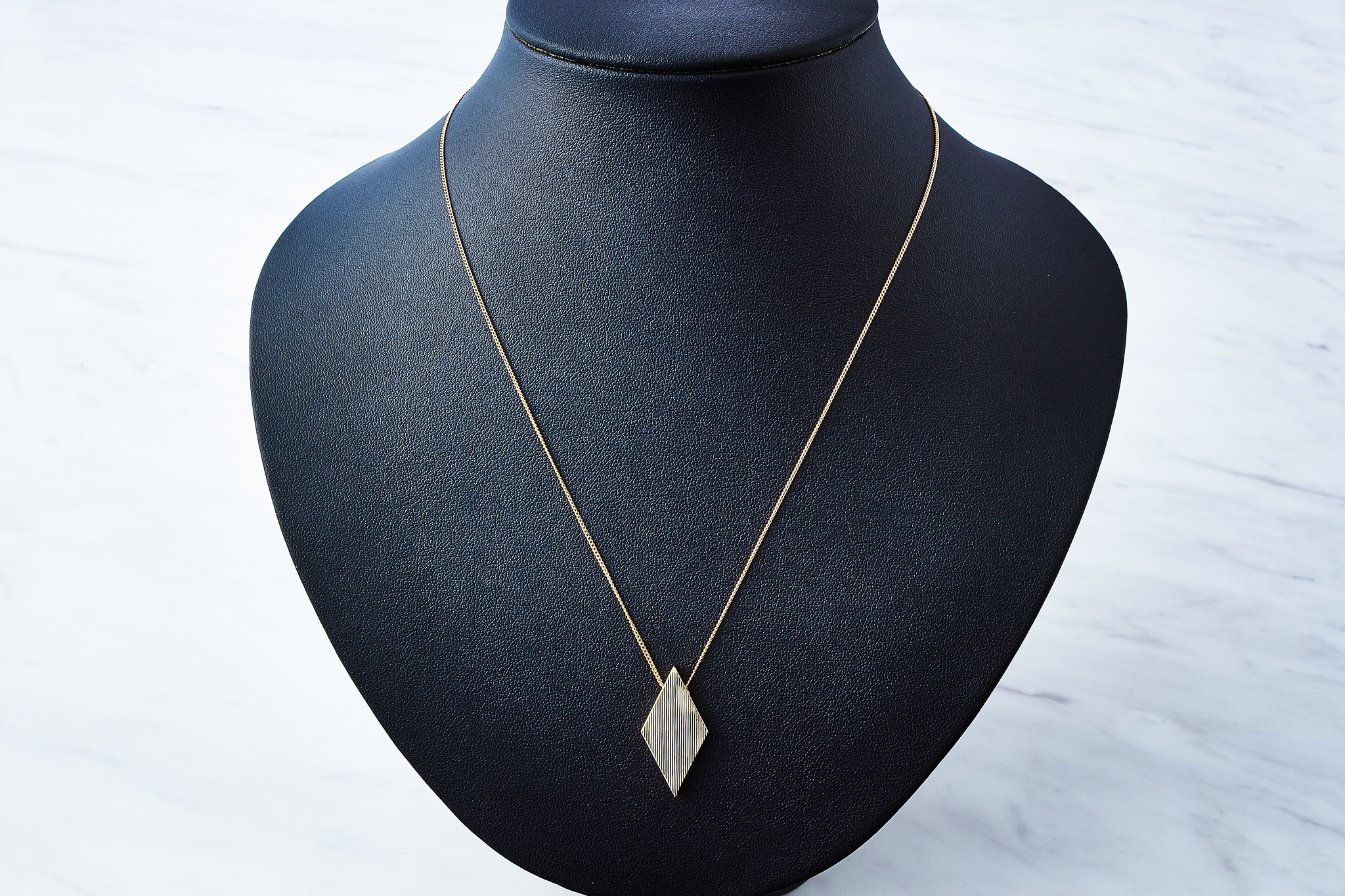 表と裏で表情の異なるリバーシブルなダイアモンド型のモチーフをトップにした、全長55cmのロングネックレス。
