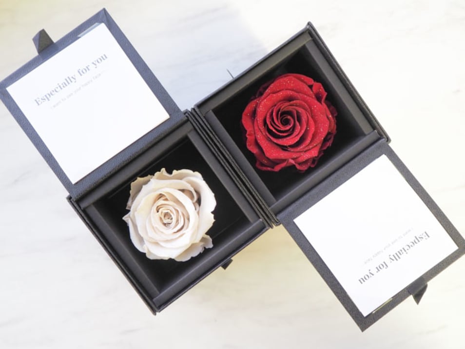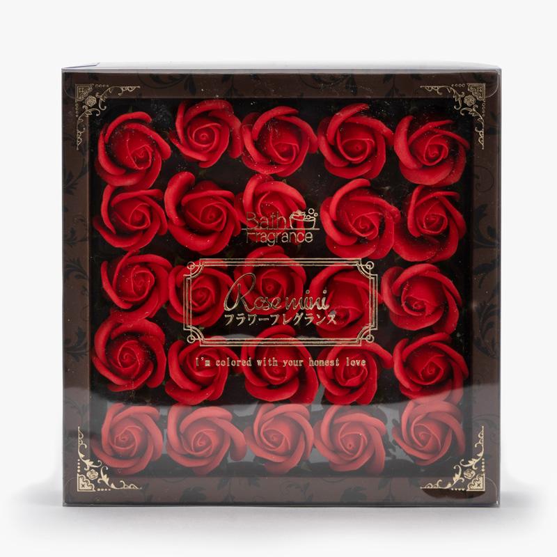 可愛らしい25輪のバラは、花びら一枚一枚がバスペタルとなっており、お湯に溶かすと入浴剤としてフローラルソープの香と彩をお楽しみいただけます。 また可愛らしいデザインですので、そのまま飾りインテリアとしてもお楽しみいただけます。 色は二種類からお選びいただけます。