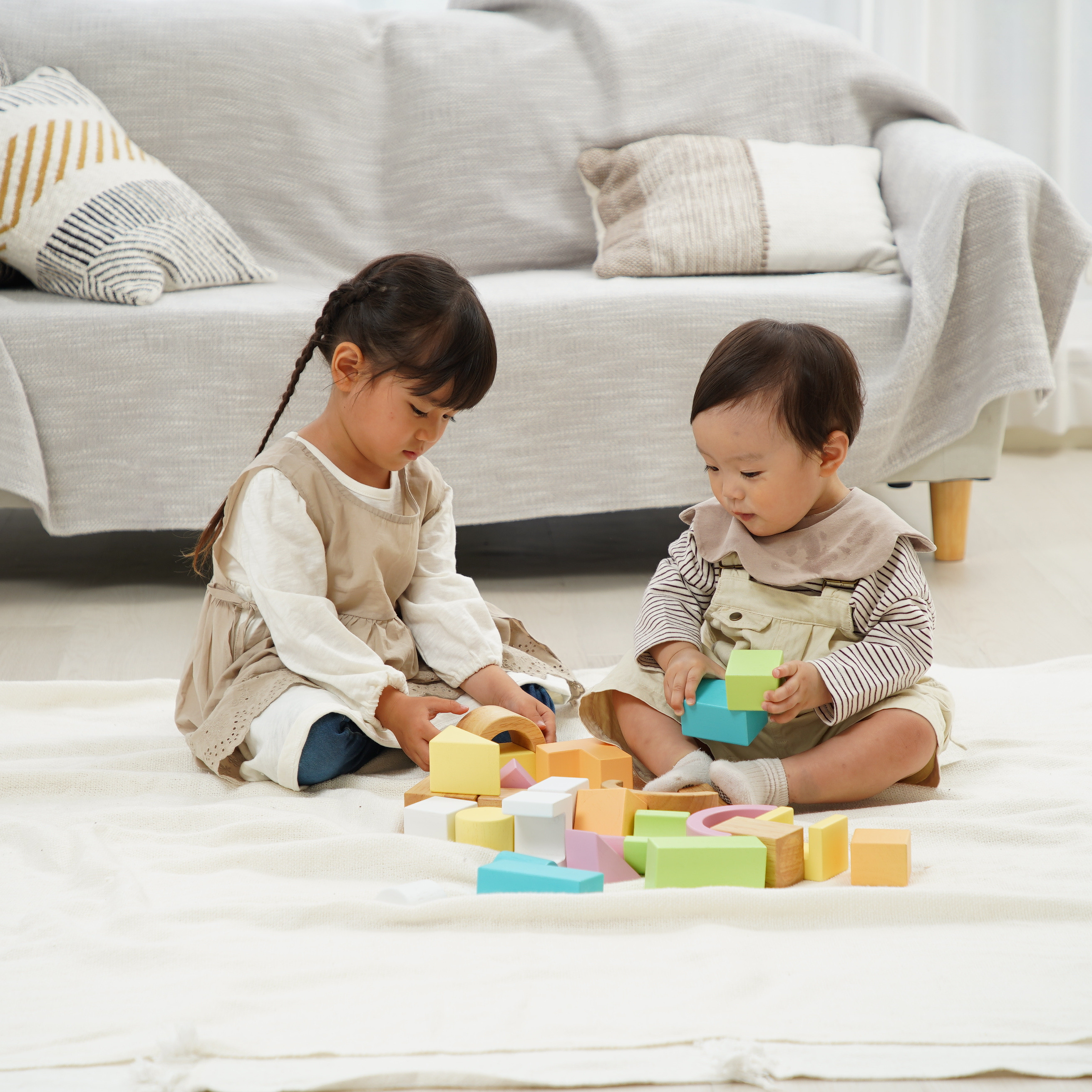 「コの字型」「L型」「アーチ型」などの積み木パーツの形が豊富なため、お子さまはバリエーション豊かに積んで遊びながら、表現力や想像力を養えます。