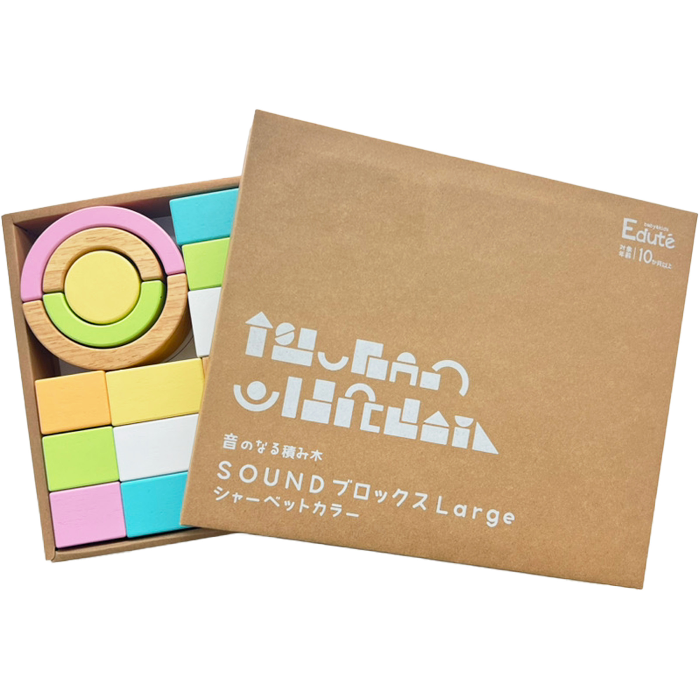 安心安全をキーワードに開発したエデュテ株式会社のオリジナルブランド「Edute baby&Kids (エデュテ ベビー アンド キッズ)」のユニークな形を詰め込んだ積み木セット。どの木のおもちゃも 角は丸く面取りされていて舐めても安全な塗料が使用されています。