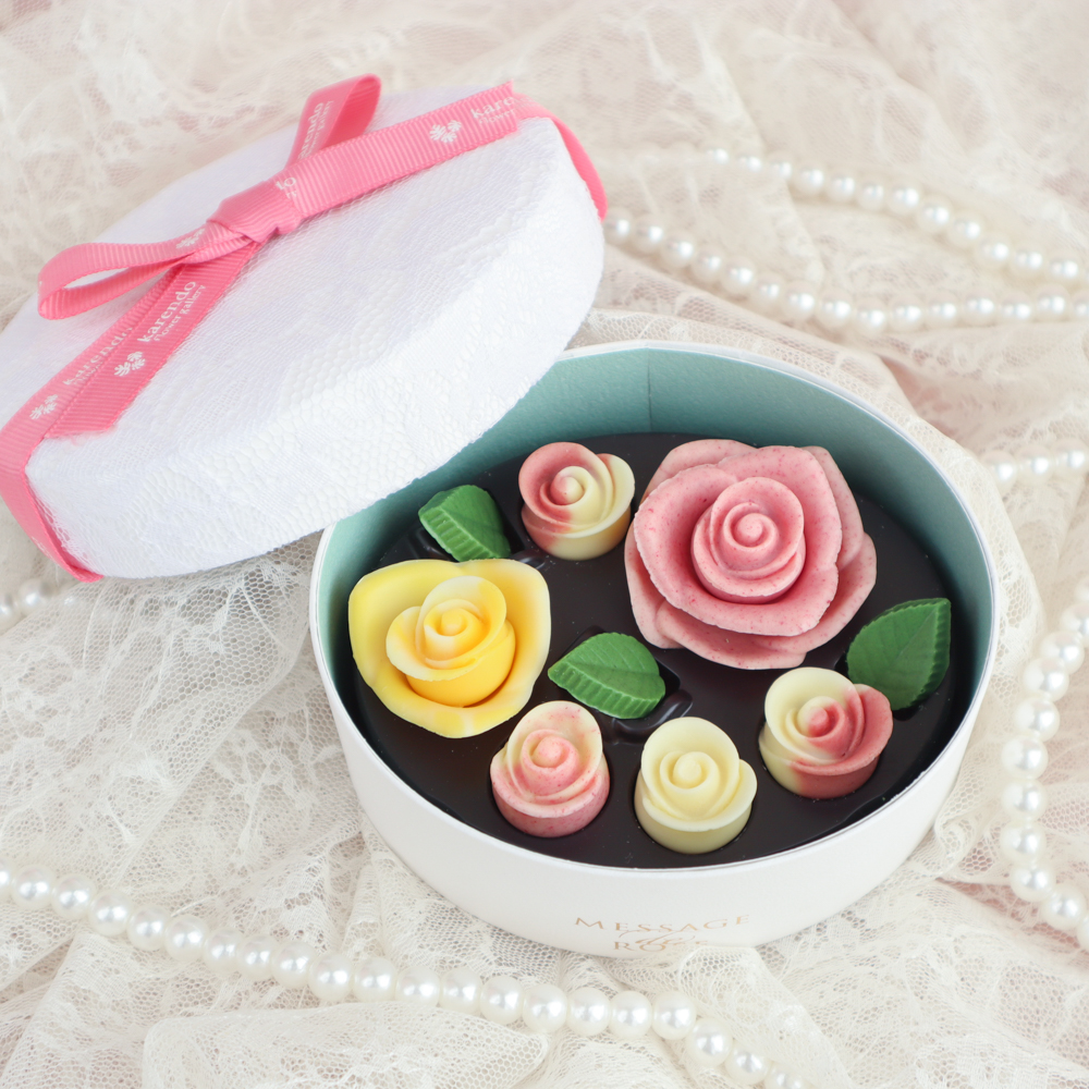1989年に誕生したメサージュ・ド・ローズ(薔薇に込めたメッセージ)。 “愛と美の象徴である薔薇の美しさをチョコレートで表現し、 メッセージを込めたい”との想いからスタートしたチョコレートブランドです。 バラの繊細な形や曲線、厚みを忠実に再現し、まるで花びらを味わうような、繊細な口当たりとやわらかな味わいのチョコレートが特徴。チョコレートは全て自社アトリエにて生産し、百貨店でも人気のブランドです。