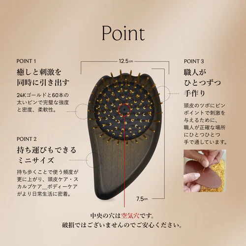 ブラシに使われている60本のピンは、頭皮のポイントにしっかり刺激を与えるために、職人が正確な場所にひとつひとつ手で通しています。 よく見ると、角度によってピンの長さと位置が微妙に違う事がわかります。