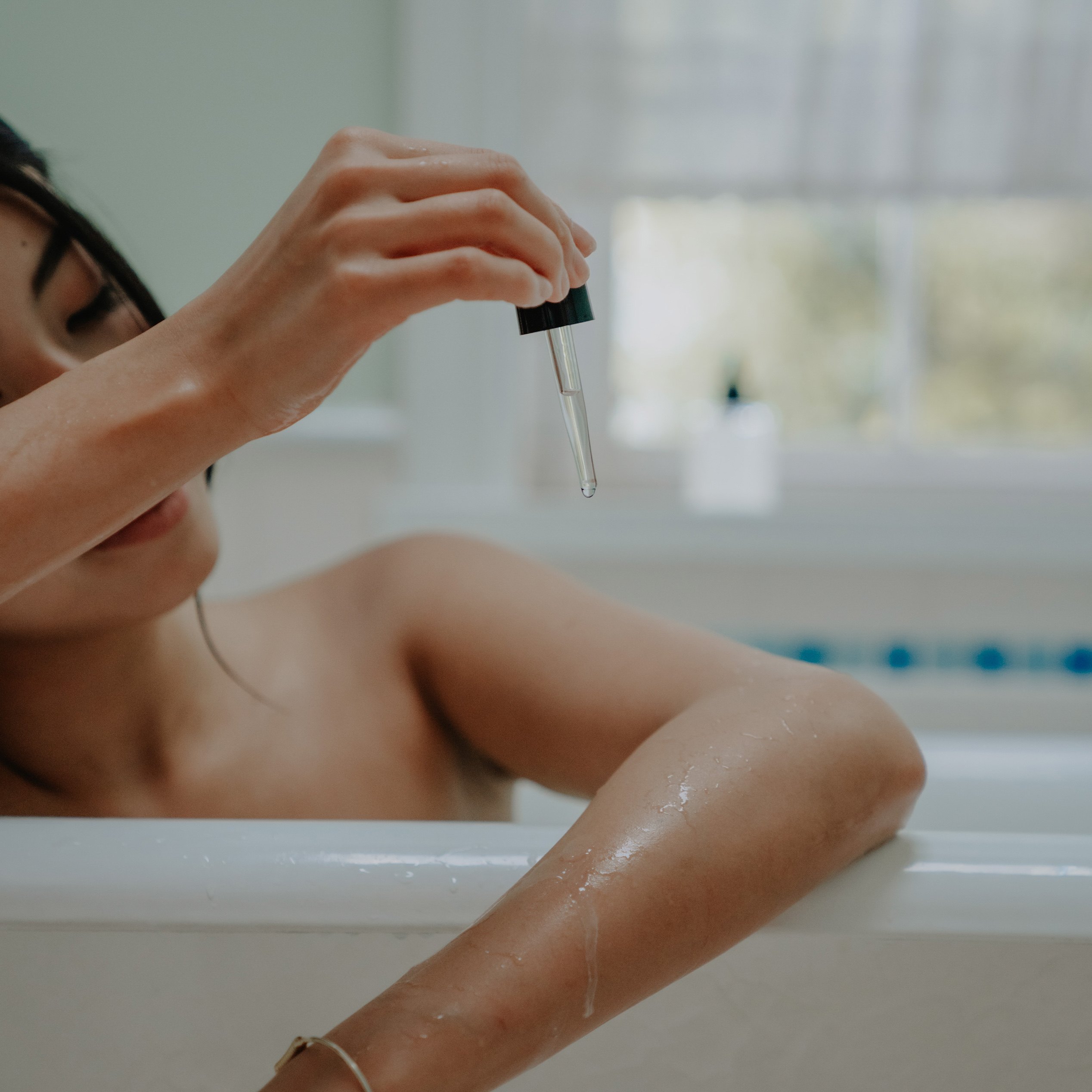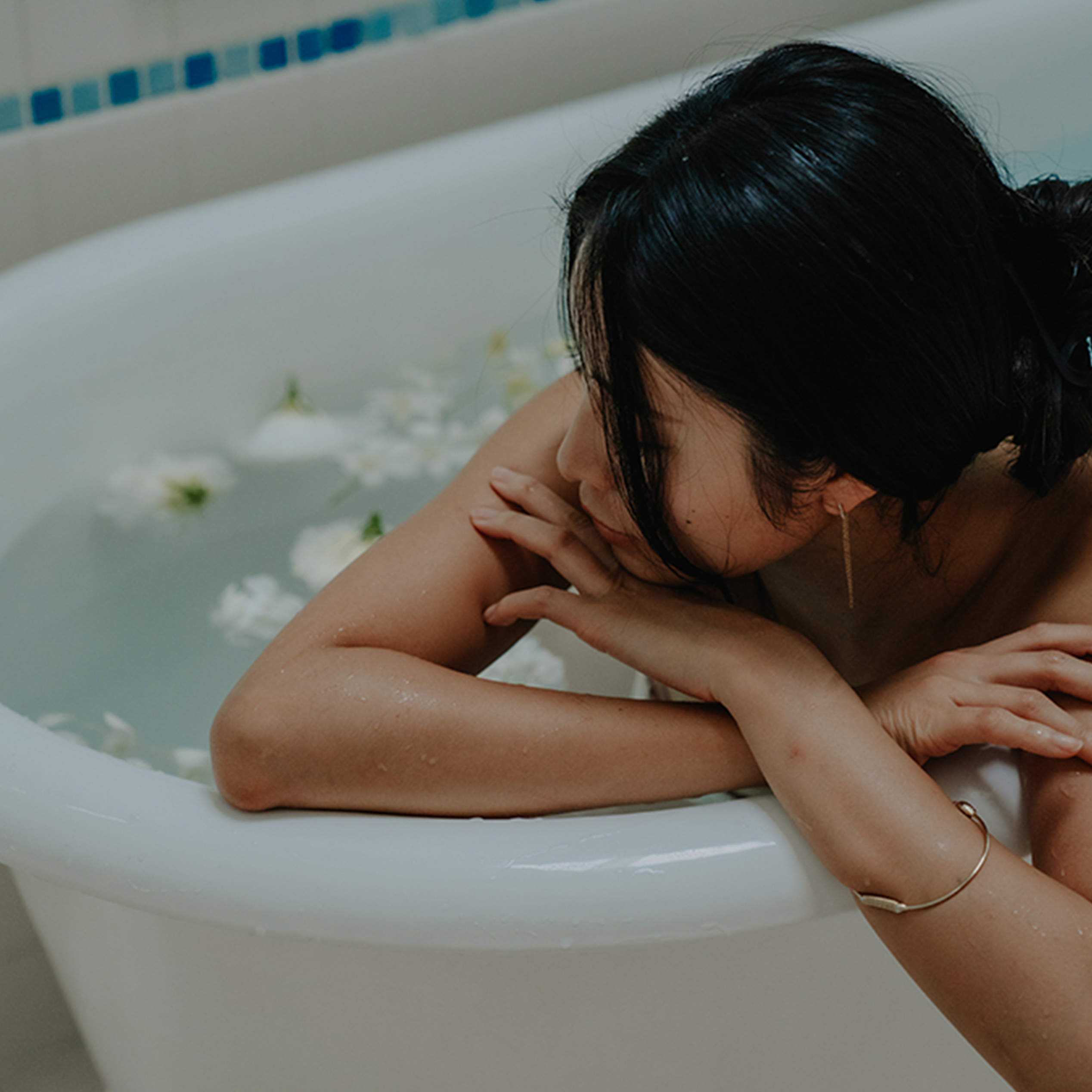 お風呂の時間を、もっと特別に。 身体に垂らしてから入浴するという新しい方法もおすすめです。 乳化するようにつくられているオイルなので、お風呂に垂らすと一度白濁し、やがてお湯全体に溶けていきます。