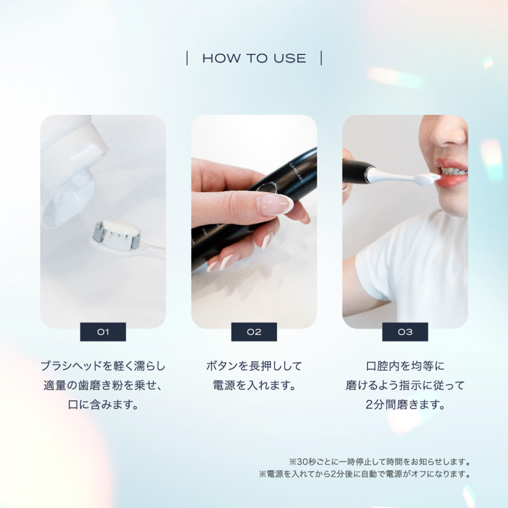 1.ブラシヘッドを軽く濡らし、適量の歯磨き粉を乗せ、口に含みます。 2.ボタンを長押しして電源を入れます。 3.ボタンを短く押し、お好みのモードを選びます。 4.口腔内を均等に磨けるよう、指示に従って2分間磨きます。