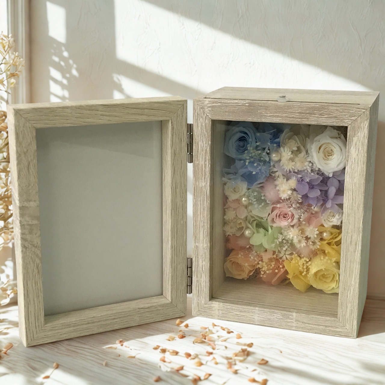 レインボーカラーの色合いが、ペットちゃんとの特別な写真をより一層引き立ててくれます。 プリザーブドフラワーは半永久的に枯れませんのでお手入れ不要です。ペットちゃんのいるご家庭でも安心して飾ることが出来ます。