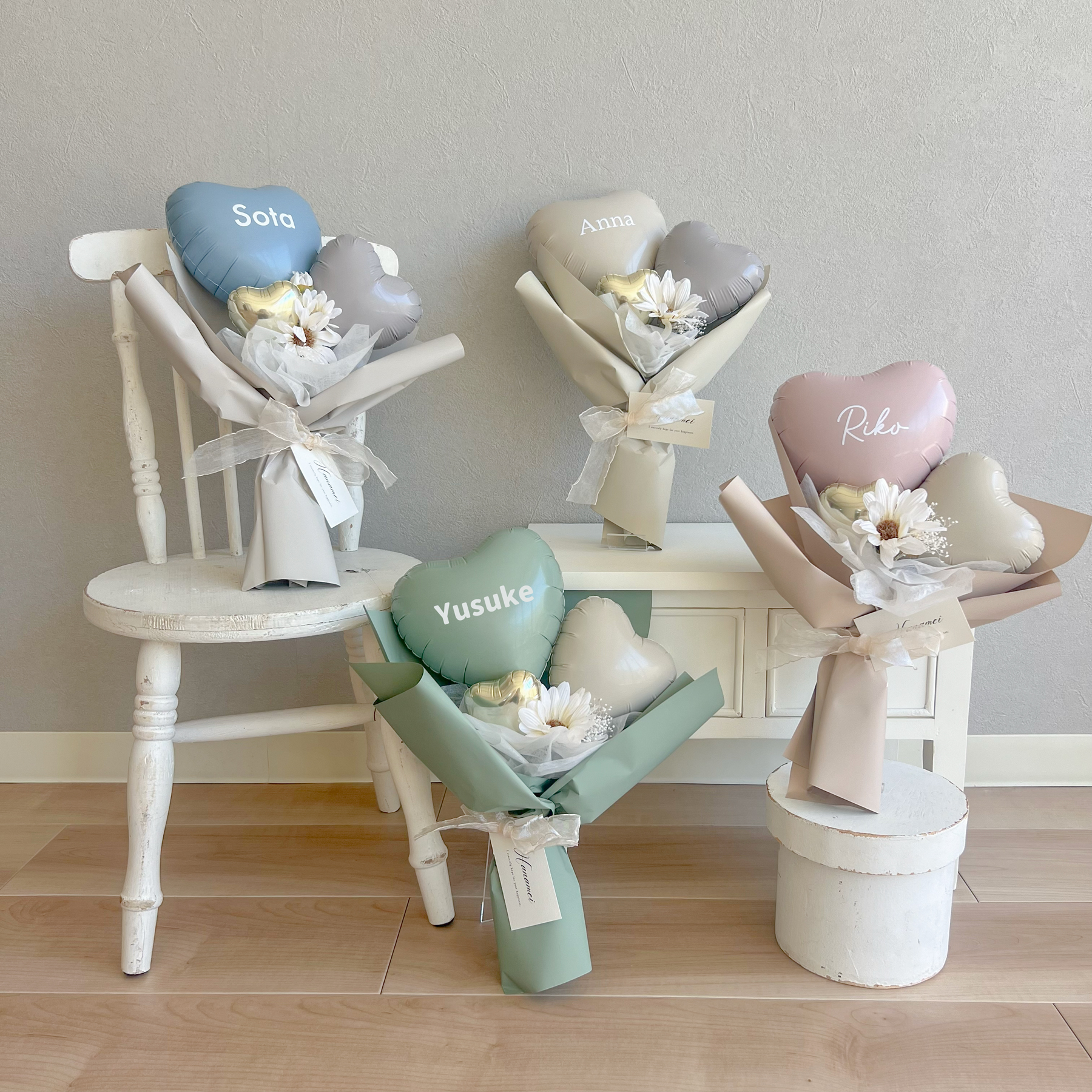 くすみカラーのハートバルーンブーケ。記念日に花束のように贈ることができ、長らく飾ってお楽しみいただけます。バルーンの部分にはお名前を無料でお付けします。