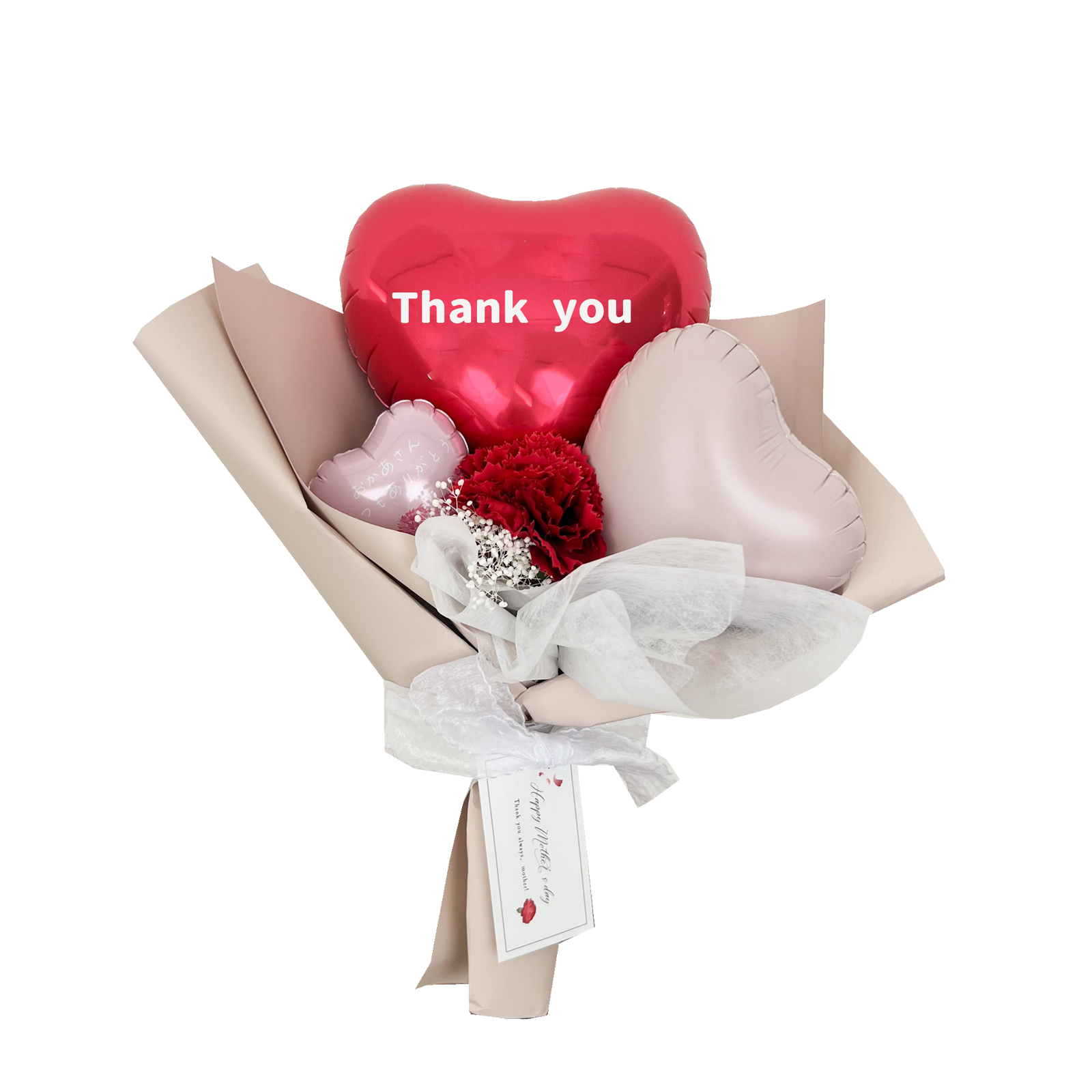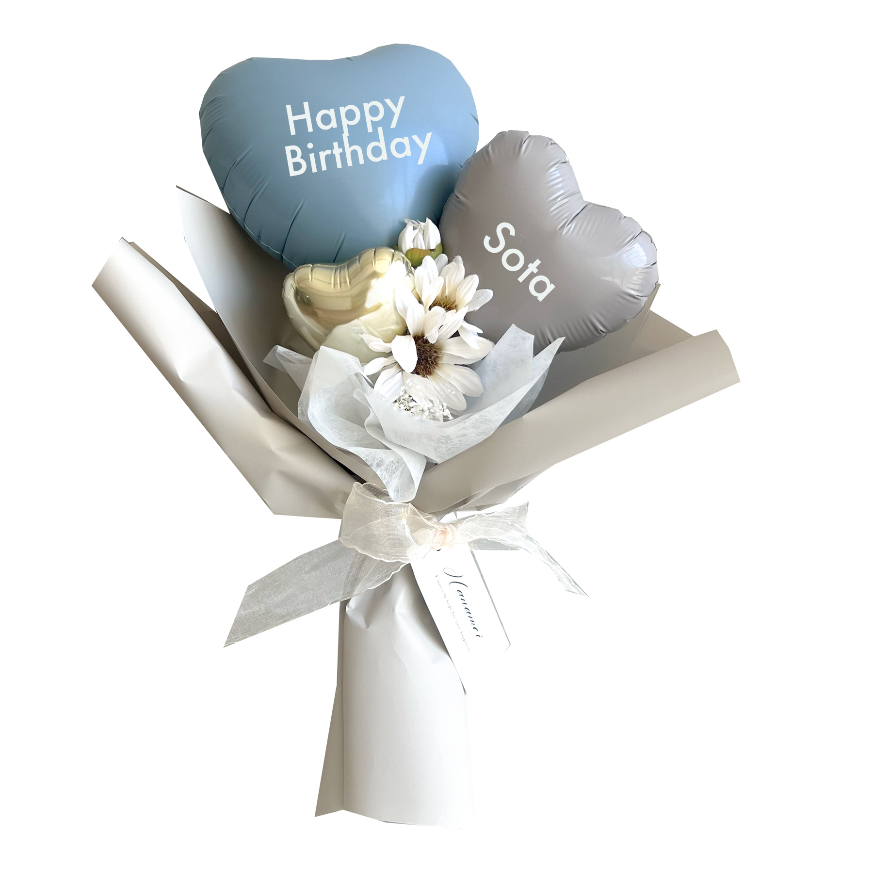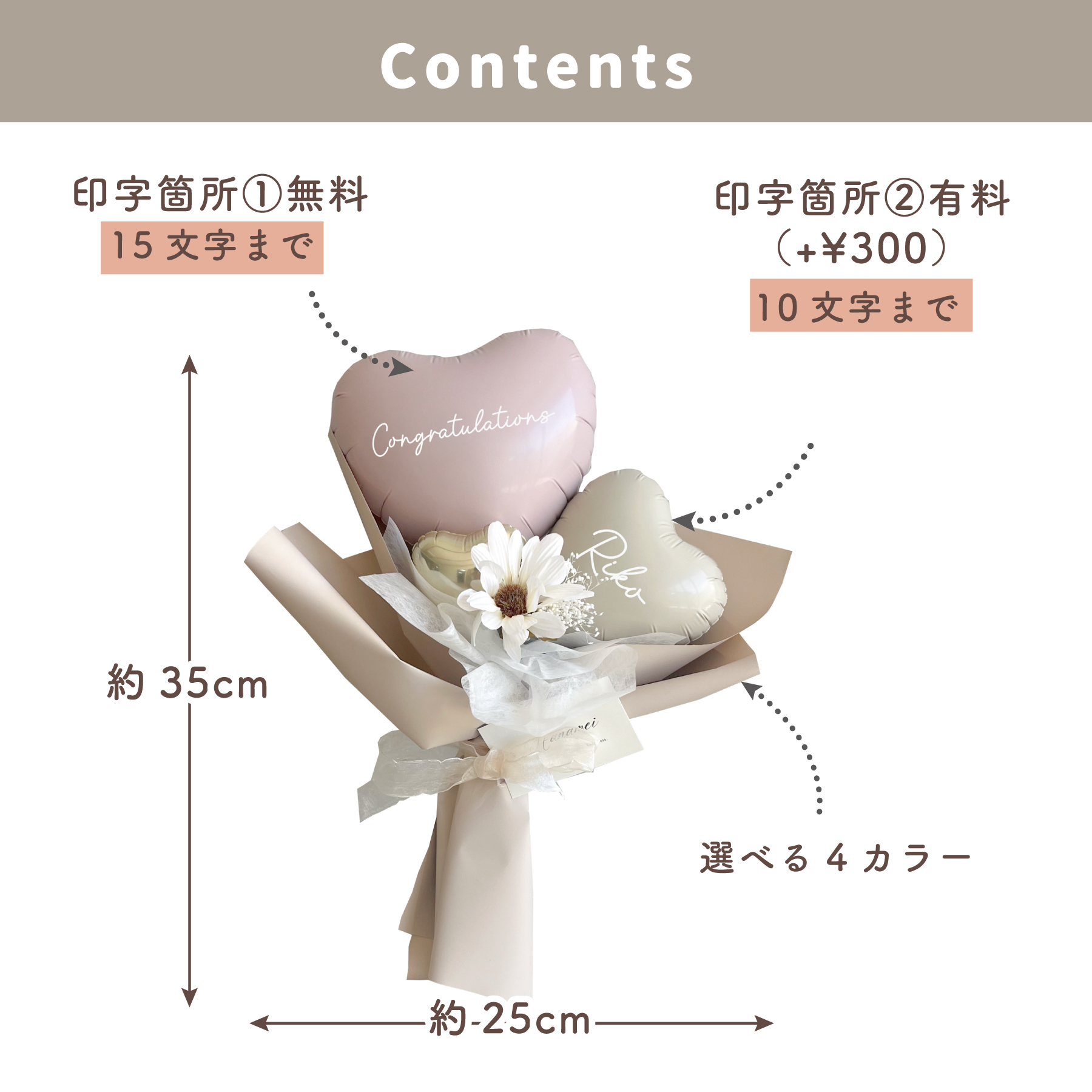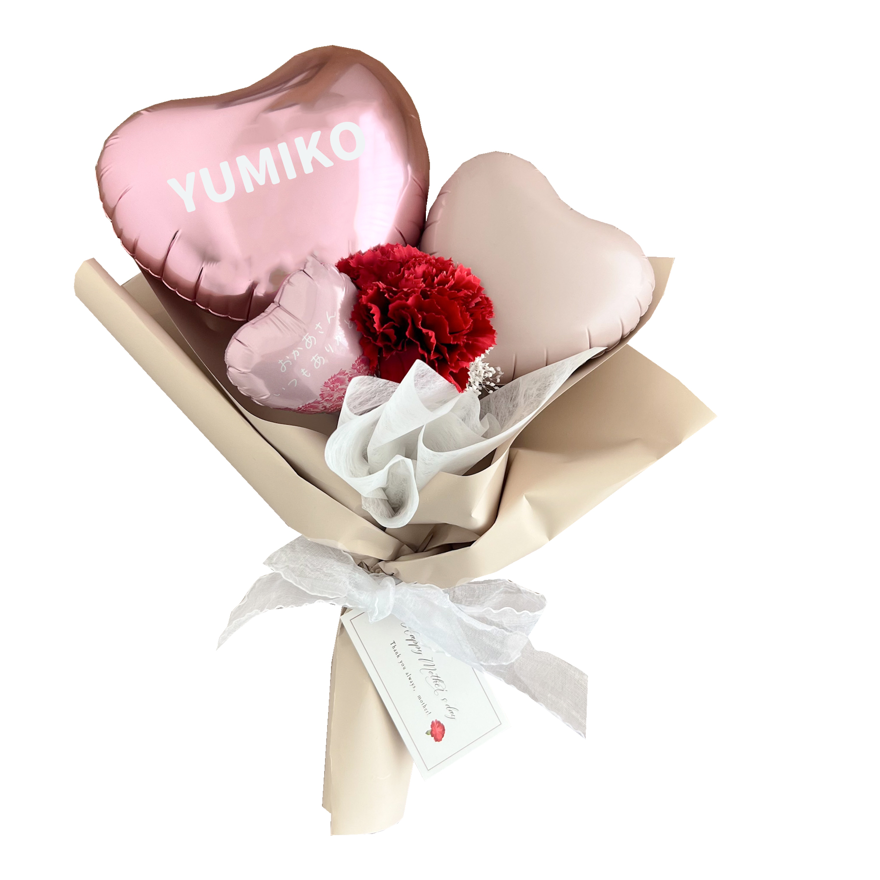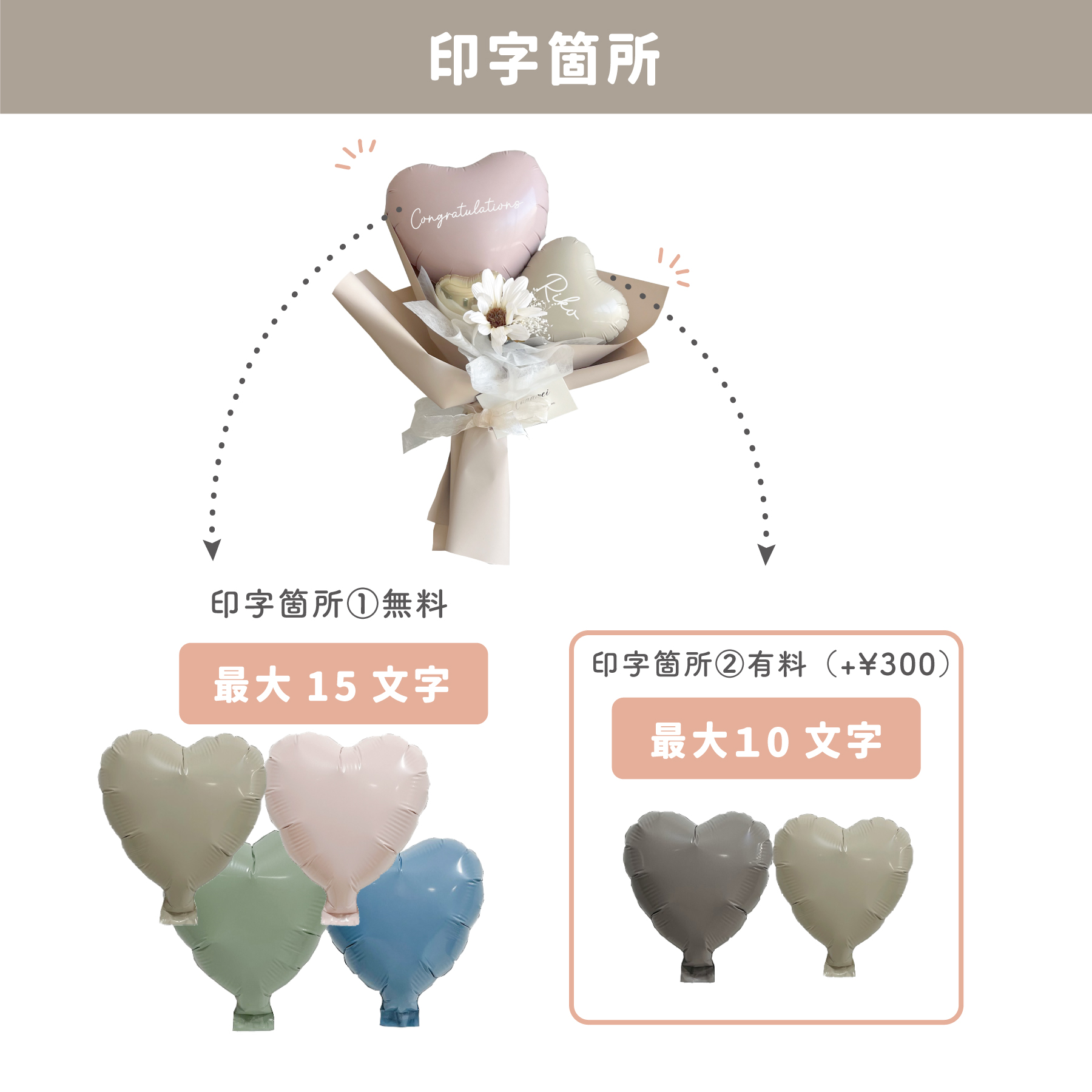 大口注文・法人のお問い合わせはこちらくすみカラーのハートバルーンがとても可愛いちょうどいいサイズのブーケです。 バルーンへの印字が2箇所可能なので、バルーンにしっかり想いを込めて贈ることができます。 ※2か所目の印字は有料になります。