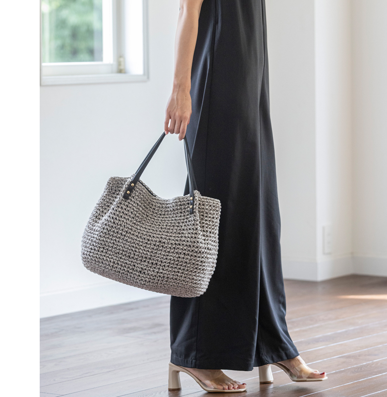 カジュアルにもきれいめにも合わせやすいシンプルなデザインに、細めのフェイクレザーハンドルがポイントです。 春から秋まで長く使えるデザインです。
