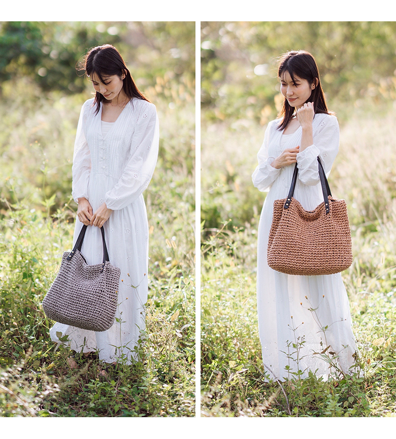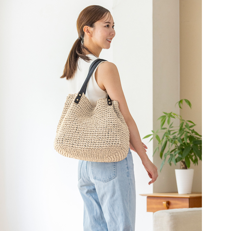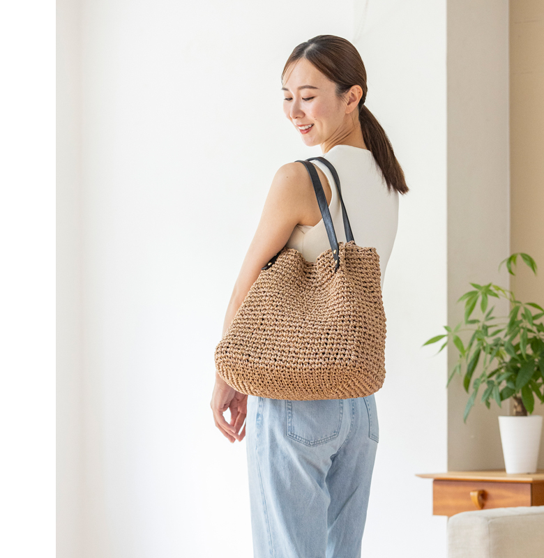 ポリエステル紐とペーパーを一つひとつ丁寧に編み込みました。 柔らか素材なので服に引っかかりにくくチクチクしません。汗をかいてもベタベタせず、爽やかにお使い頂けます。