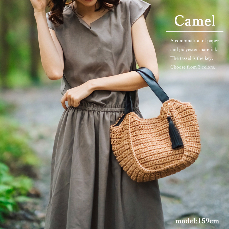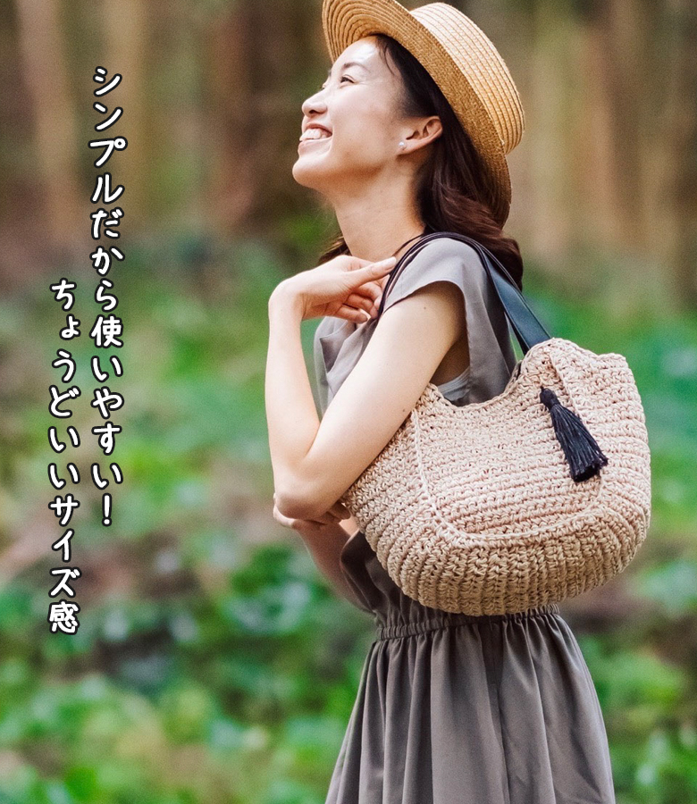 ペーパーとポリエステル紐を合わせて編み上げた上品なかごバッグ。大きすぎず小さすぎない、ちょうどいいサイズ感です。