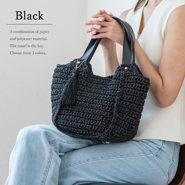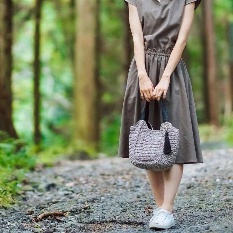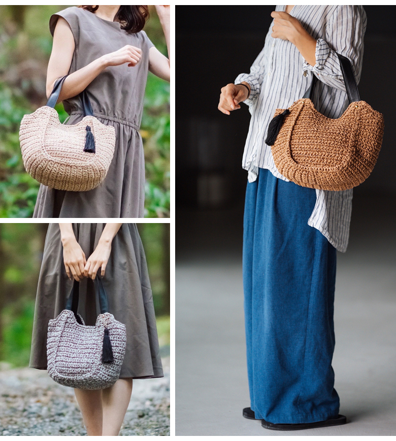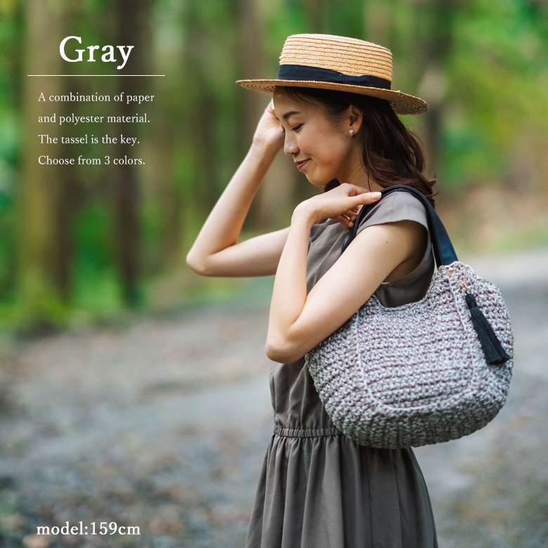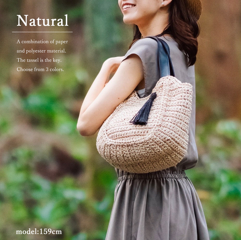 大口注文・法人のお問い合わせはこちら柔らかなペーパー素材と耐久性に優れたポリエステル紐を組み合わせ、一つひとつ丁寧に手編みで仕上げました。 服に引っかかりにくく、肌に触れてもチクチクしない柔らかな素材です。