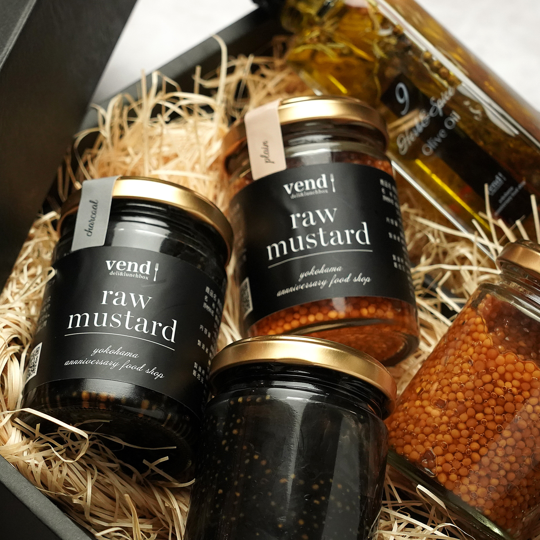 熟成生マスタード「プレーン」2点、「チャコール」2点、「9ハーブ&スパイスオリーブオイル」1点をセットにしたギフトボックスです。いつもの料理の仕上げに1スプーンを加えるだけで、贅沢でより特別な一皿に生まれ変わり、ご自身や大切な方の食卓に健康や笑顔を想う気持ちをお届けいたします。