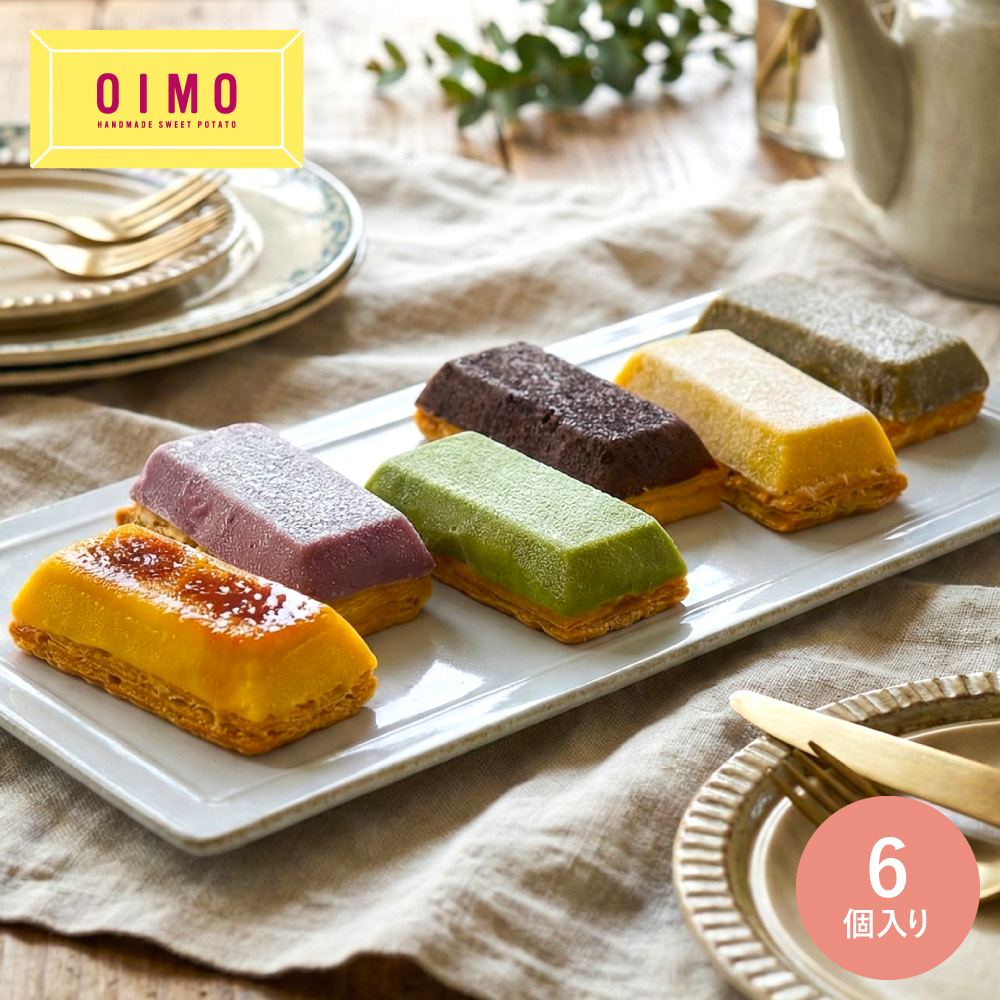大口注文・法人のお問い合わせはこちら口溶けなめらかなさつまいもペーストにサクサクパイ生地を合わせたOIMOの看板商品。スイートポテトのイメージを覆すカラフルな見た目に、箱を開けた瞬間から驚いていただけるはず。
