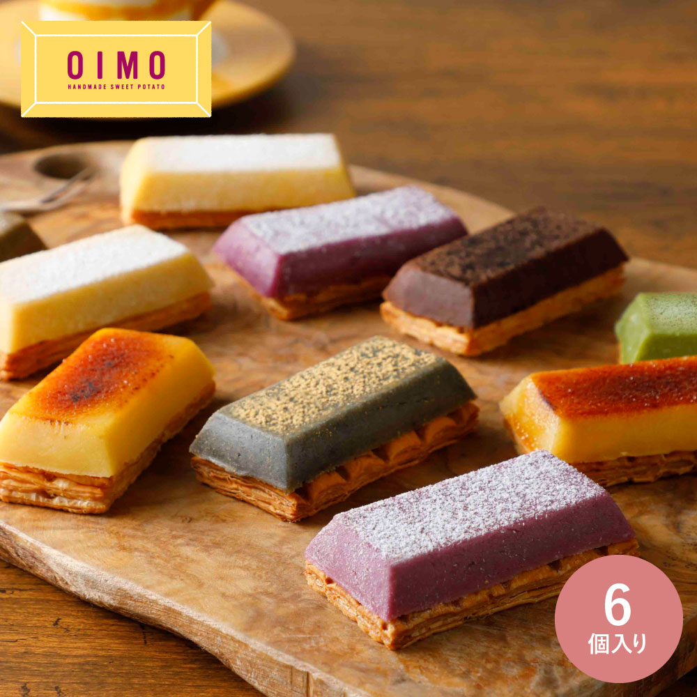 大口注文・法人のお問い合わせはこちら口溶けなめらかなさつまいもペーストにサクサクパイ生地を合わせたOIMOの看板商品。スイートポテトのイメージを覆すカラフルな見た目に、箱を開けた瞬間から驚いていただけるはず。