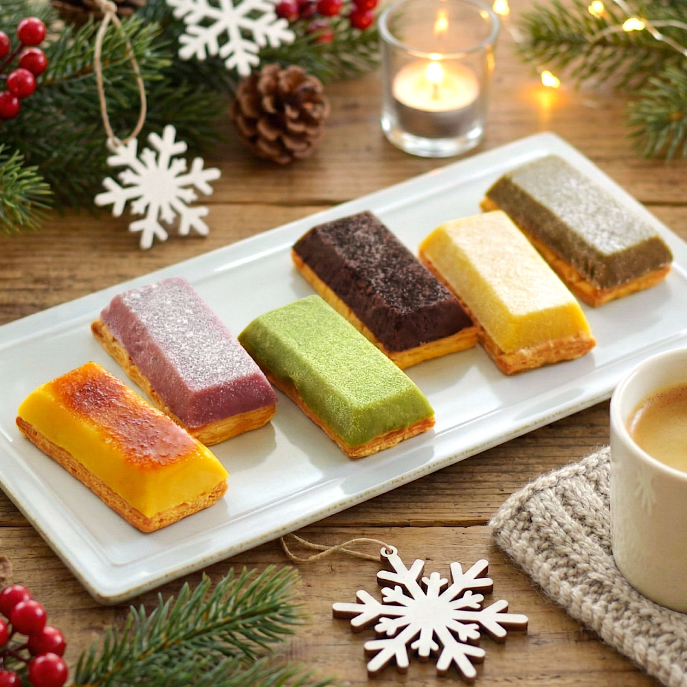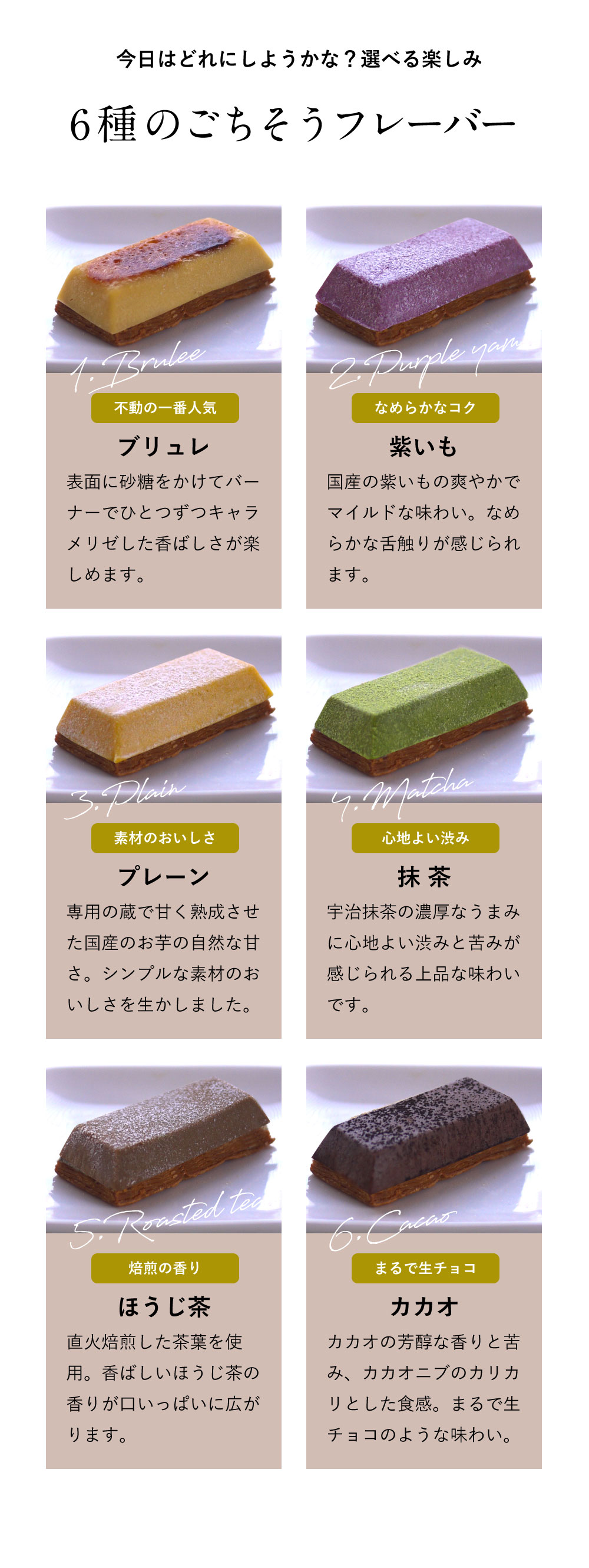| 内容量/数量 | 6個(プレーン・紫いも・ブリュレ・抹茶・ほうじ茶・カカオ各1個) |