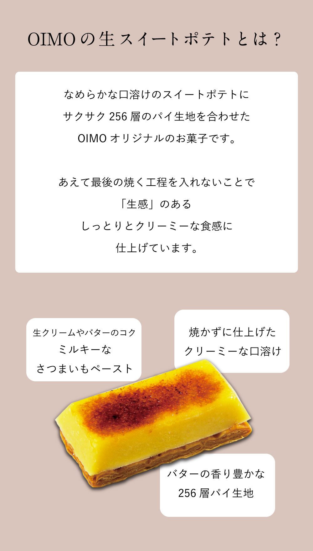 大口注文・法人のお問い合わせはこちら口溶けなめらかなさつまいもペーストにサクサクパイ生地を合わせたOIMOの看板商品。スイートポテトのイメージを覆すカラフルな見た目に、箱を開けた瞬間から驚いていただけるはず。