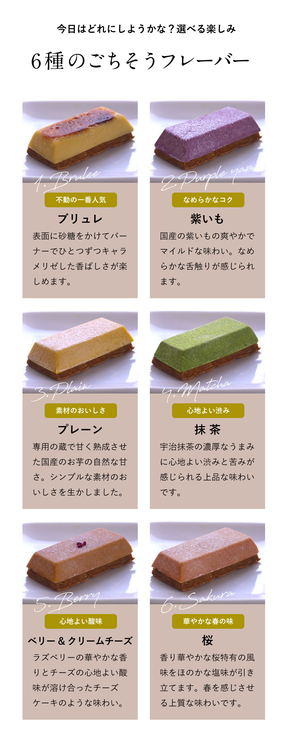 | 原材料 | 【プレーン】さつまいも(国産)、砂糖、小麦粉、バター、生クリーム、植物性油脂、粉糖、(一部に小麦・乳成分を含む)【紫いも】さつまいも(国産)、砂糖、紫いも、小麦粉、バター、生クリーム、植物性油脂、粉糖、(一部に小麦・乳成分を含む)【ブリュレ】さつまいも(国産)、砂糖、小麦粉、バター、生クリーム、植物性油脂、(一部に小麦・乳成分を含む)【カカオ】さつまいも(国産)、砂糖、小麦粉、バター、牛乳、生クリーム、ココアパウダー、植物性油脂、 カカオニブ、(一部に小麦・乳成分を含む)【ミルクティー】さつまいも(国産)、砂糖、小麦粉、バター、生クリーム、植物性油脂、紅茶、(一部に小麦・乳成分を含む))【ベリー&クリームチーズ】さつまいも(国産)、砂糖、小麦粉、クリームチーズ、ラズベリー、バター、転化糖、粉糖、 (一部に乳成分、小麦を含む) |