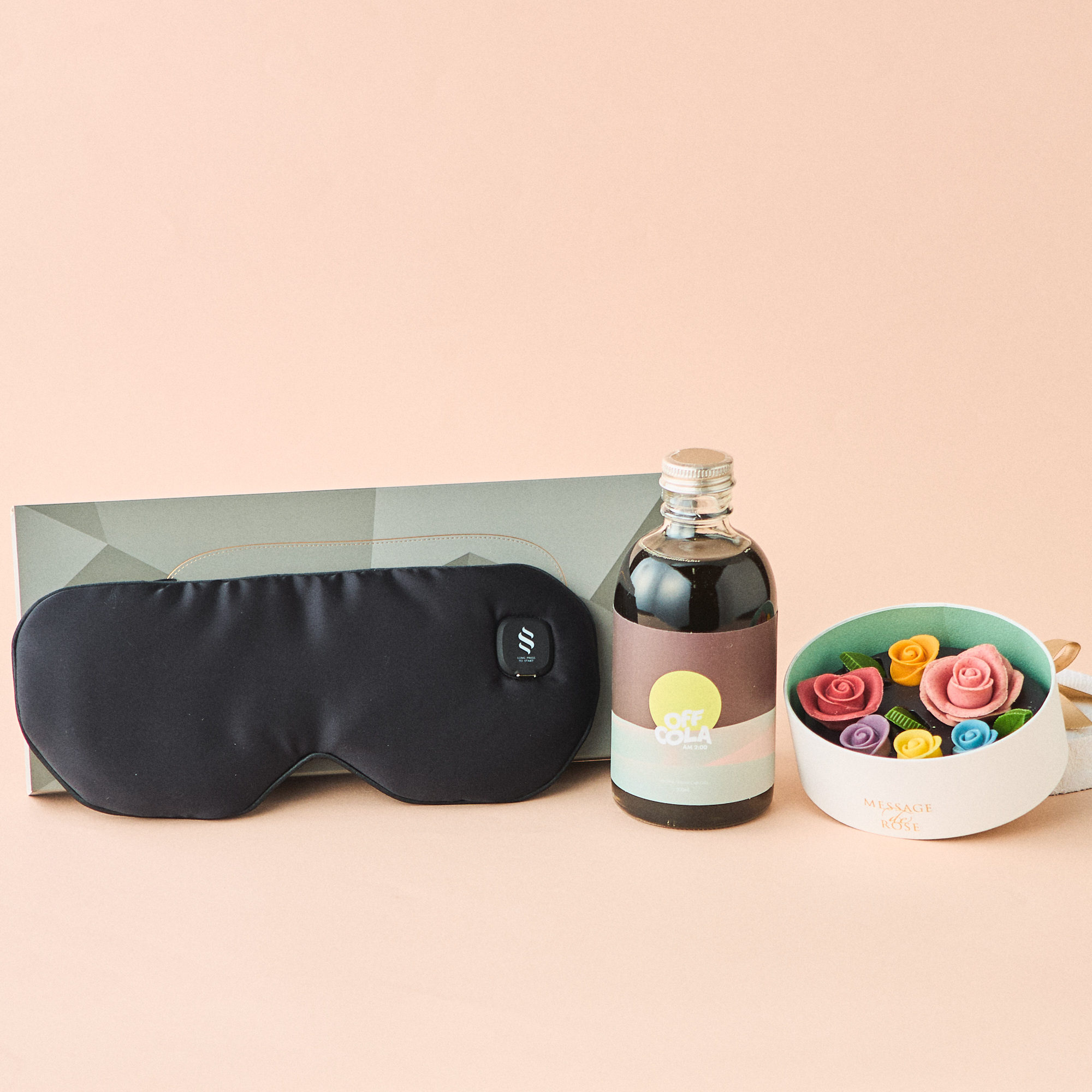 『体のケアと癒し』をコンセプトとしたお店「SALUA(サルア)」のUSB充電式のホットアイマスクと、国内トップレベルのパティシエが監修したクラフトコーラに、「MESSAGE de ROSE」×「karendo」がコラボレーションした期間限定チョコレートの3点セットです。
