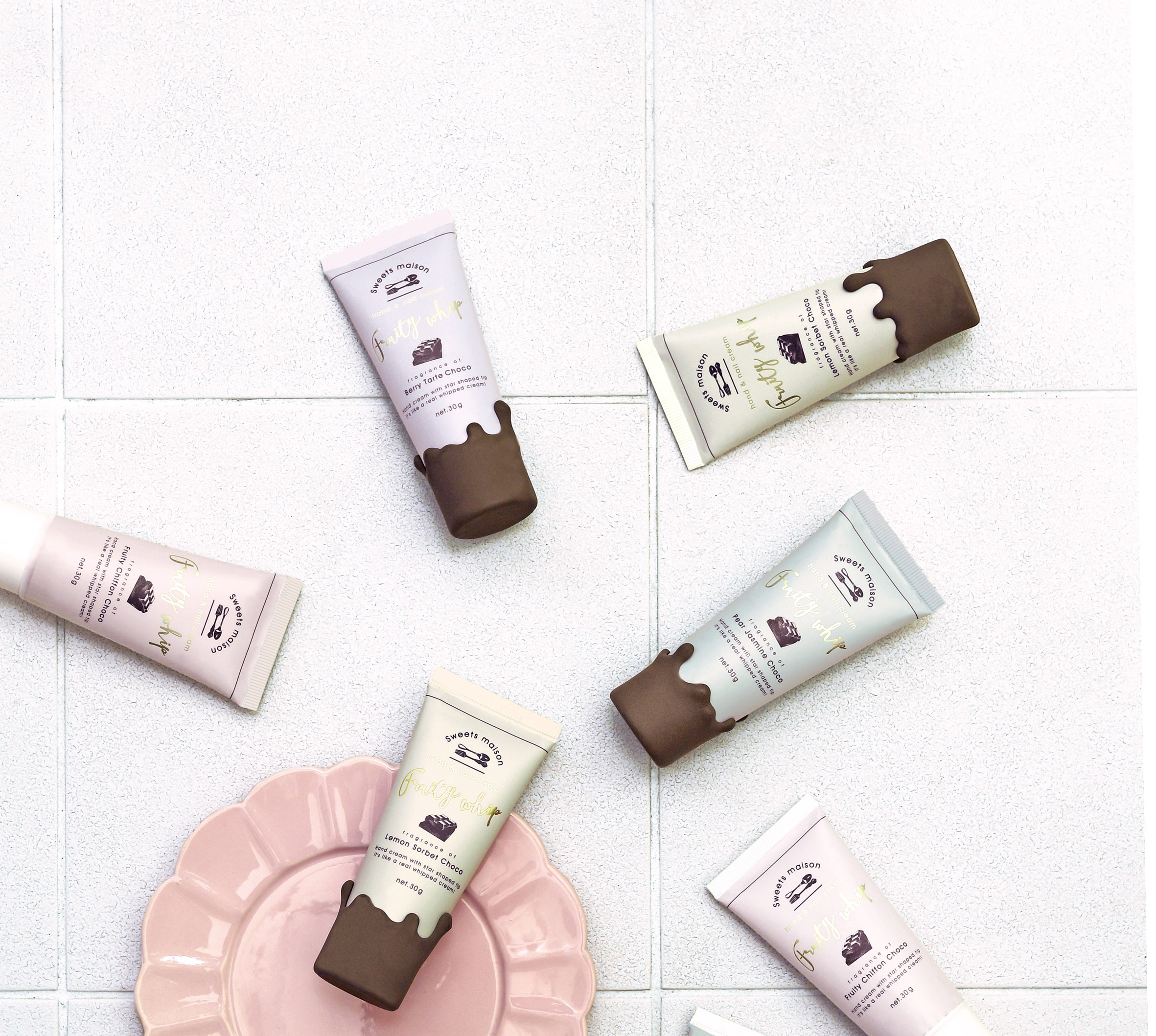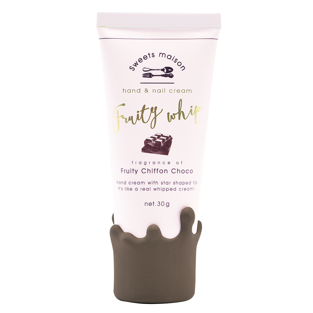 星型の絞り口からホイップのようにクリームが出てきます。 キャップは溶けたチョコレートをモチーフにしており、持ち歩いていても、使用しても可愛いハンドクリームです。